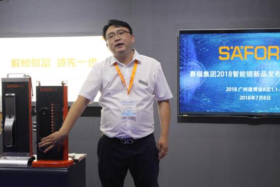 賽福集團(tuán)總經(jīng)理苗育松發(fā)布賽福自主研發(fā)新品——智能密碼鎖新品金庫(kù)JK-01和智能指紋鎖新品SF5500