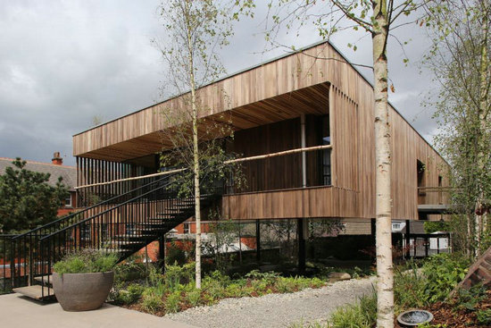 由dRMM建筑師事務(wù)所設(shè)計(jì)的麥吉斯奧爾德姆中心是英國第一座使用熱處理美國鵝掌楸木建造外墻飾面的建筑物。熱處理木材是指在將木材加熱到180度以上進(jìn)行改良的木材。這種窯干工藝可提高木材的穩(wěn)定性和耐久性,并降低木材的長期收縮率和膨脹率。該工藝可改變木材的外觀,令其通體呈現(xiàn)更深的棕色色調(diào)。盡管在木材熱處理過程中會額外消耗少量能源,但從生命周期分析表明,經(jīng)熱處理的最終產(chǎn)品比化學(xué)處理的木材具有更好的環(huán)境影響,并且還具有其它更多的優(yōu)勢,比如:無需特殊的預(yù)處理,以及棄用后的木材更為環(huán)保等等。尤其是美國鵝掌楸木,易于機(jī)器處理加工、重量輕、性價(jià)比高,作為外墻覆蓋材料的發(fā)展前景尤為光明。