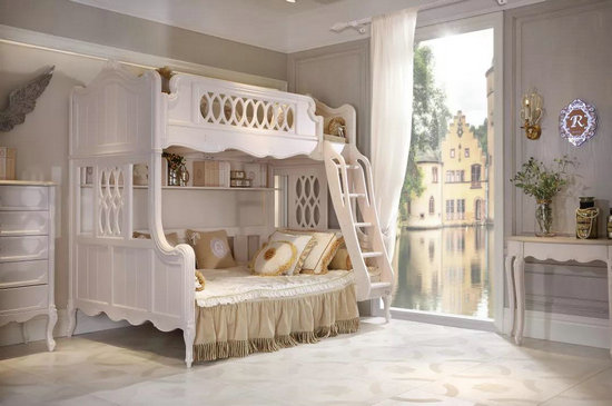 豆丁莊園貴族溫莎城堡套房盡顯高貴優(yōu)雅之態(tài):貝殼白之色彩配以手工擦拭銀粉之工藝,更顯高端大氣。圓潤(rùn)流暢的線條、上床的安全護(hù)欄、海豚式扶梯和法式芭蕾床腳的結(jié)合,輝映著溫莎王朝昔日的繁華,寓意為孩子帶來幸福與安全。
