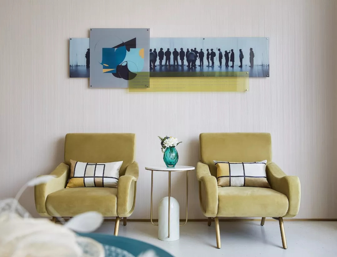 2F相對私密的洽談空間,家具同樣以自然幾何形態(tài)置入,圓形的茶幾、流線型的沙發(fā)、發(fā)光藝術(shù)裝置掛畫,讓空間既高雅又舒適。
