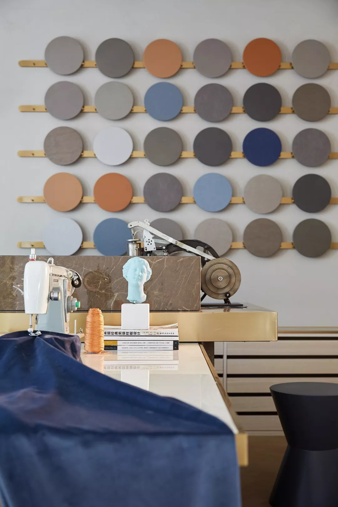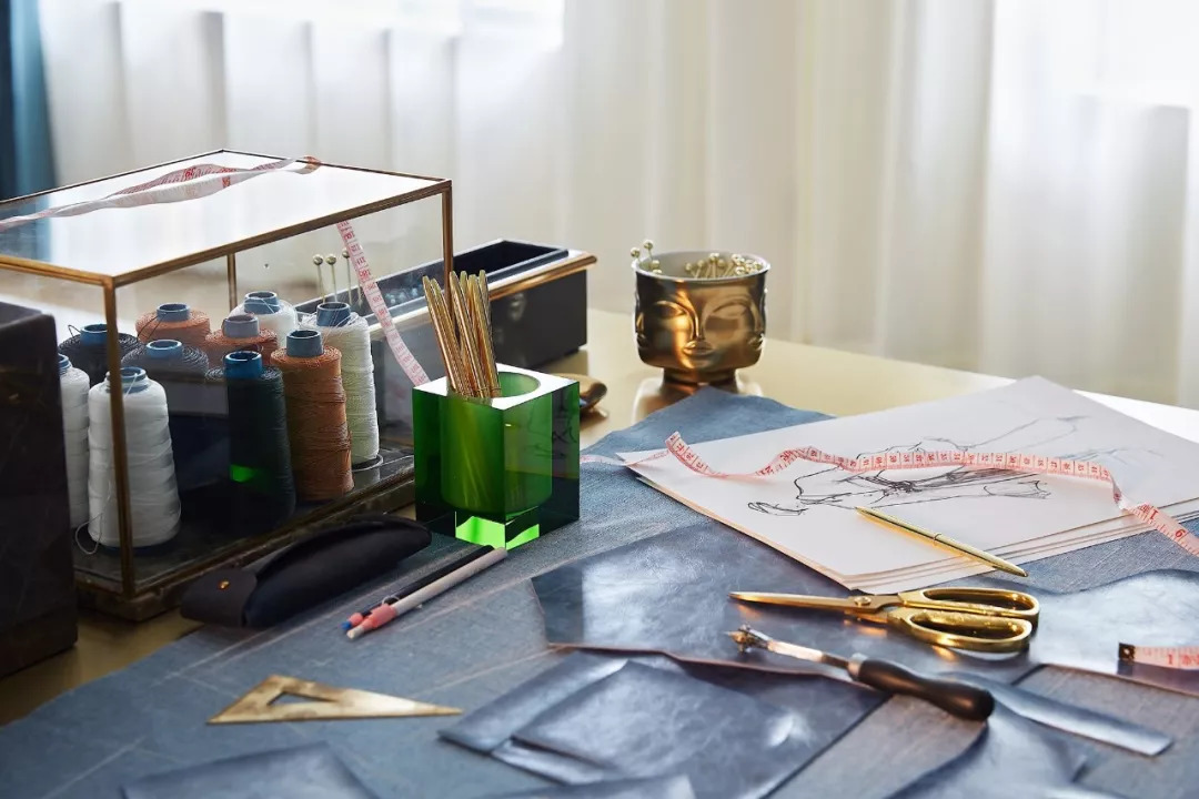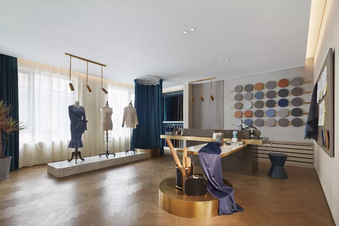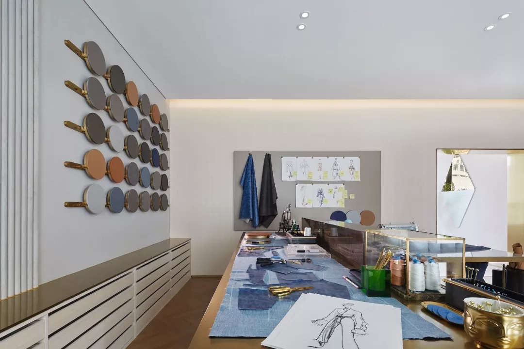 3F主要陳設(shè)了Fern Wu的工作流水臺——從小樣、色板、材質(zhì)展示到毛料裁縫臺一應(yīng)俱全——稀有、歷史感和手工定制是該空間的標(biāo)志。