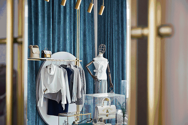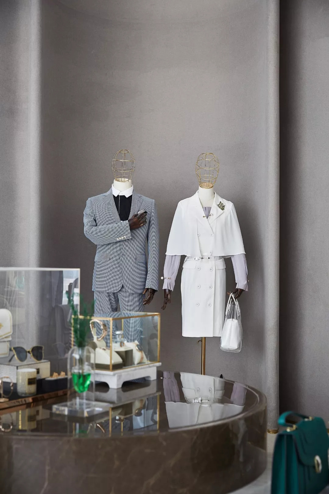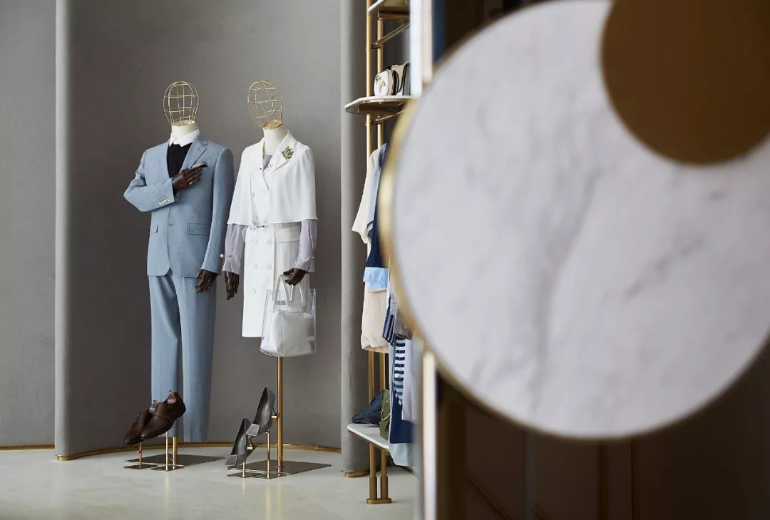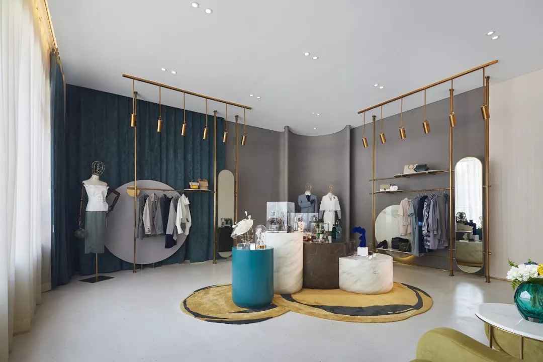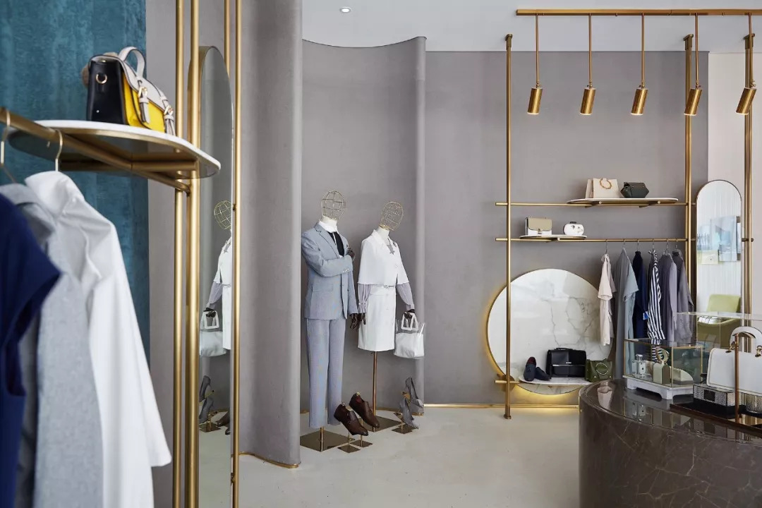 在1F成衣、飾品、配飾展示廳,幾何圖形與線、面的搭配,呈現(xiàn)時尚又不失大氣,大面積的高級灰,大理石、金屬等搭配精致而富有藝術(shù)感,連貫而富有詩意地形成空間的優(yōu)雅品位。