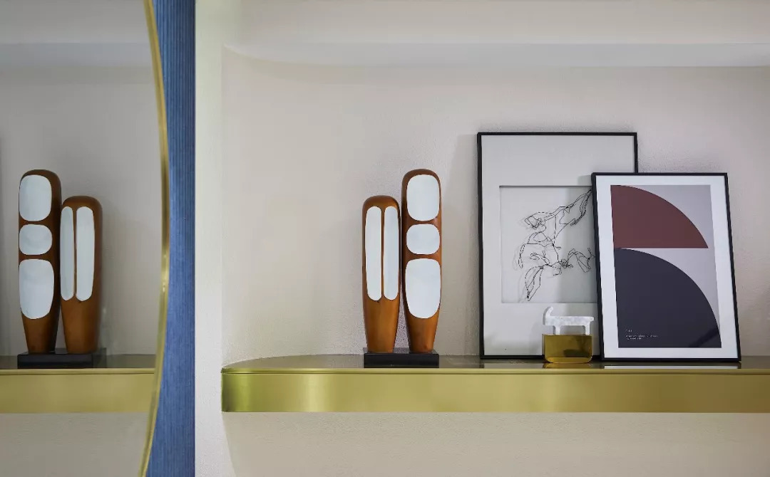 為改善下沉空間光線不足的壓抑感,讓空間更為靈動,在內(nèi)斂、沉穩(wěn)的灰咖色及木色調(diào)之上,大膽明媚的陳設(shè)使空間具有鮮活的生命力,視覺張力顯露無疑,喚醒人們直覺上的共鳴——放松、停駐、欣賞與思考。