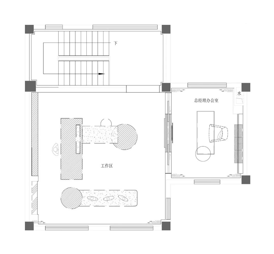 工作室的室內(nèi)設(shè)計由集艾設(shè)計擔(dān)綱,合作過程中緊密溝通,并且,則靈藝術(shù)將室內(nèi)的設(shè)計元素沿用到軟裝設(shè)計上,力求從設(shè)計語言上保持一致,實現(xiàn)軟硬裝融合。