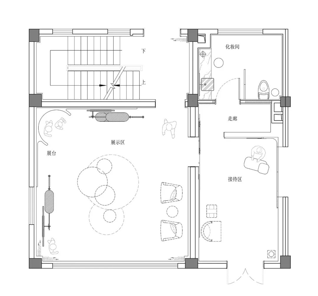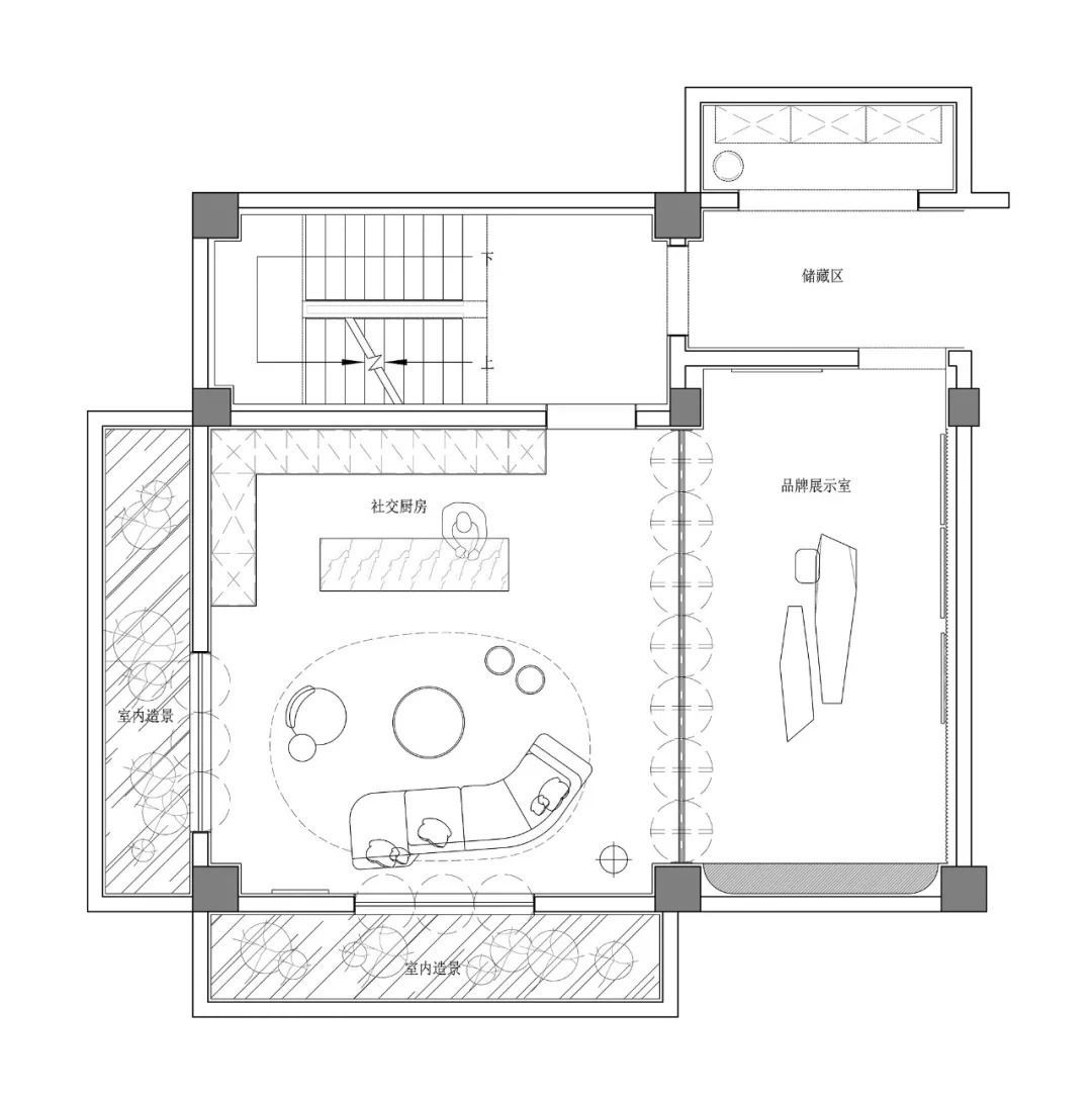 真正的藝術(shù)呈現(xiàn)是基于生活的形式與意義的再處理,為空間賦予獨(dú)特的藝術(shù)知覺。夾層的空間功能是私密聚會和服裝發(fā)布,設(shè)計營造氛圍,向參與者發(fā)出邀請。