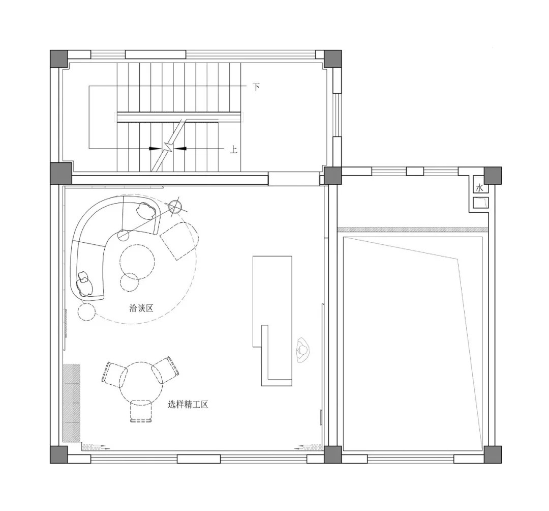 工作室1F設(shè)定為招待展示區(qū),可以在此處對這家工作室的產(chǎn)品有個基礎(chǔ)了解;2F供深度洽談以及選樣;3F則是設(shè)計師們的工作區(qū)域;為工作室的重要客人和朋友,規(guī)劃了夾層空間,可以進(jìn)行私密高級的聚會,同時此處還承擔(dān)舉行發(fā)布會的功能。