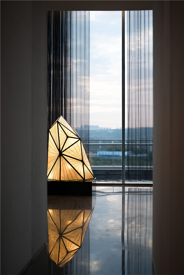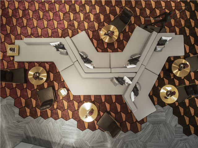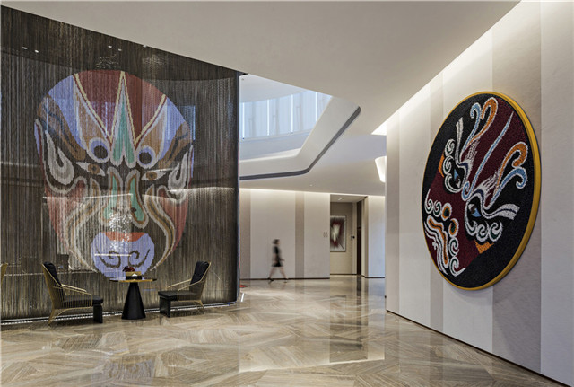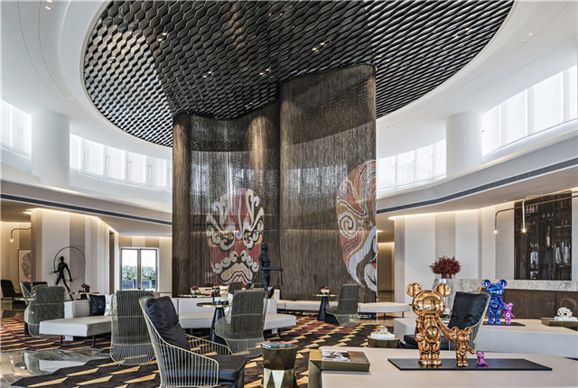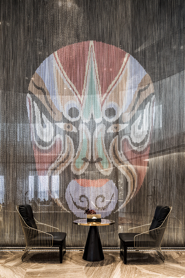 洽談區(qū)中庭,幾何圖形構(gòu)造的立體鏡鋼吊板,與色彩大膽絢麗的六邊形地毯圖紋相互呼應(yīng),色塊與線條碰撞出浪漫而不羈的藝術(shù)觀感。由天花板垂下的不銹鋼掛簾,編織成巨幅的川劇臉譜圖畫,將川渝文化之精髓與現(xiàn)代工藝巧妙結(jié)合,制造出空間中最具張力的視覺焦點(diǎn),光線微微穿透其中,傾瀉出與眾不同的空間魅力,在另類新奇中隱現(xiàn)設(shè)計(jì)美感。