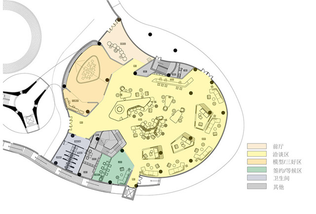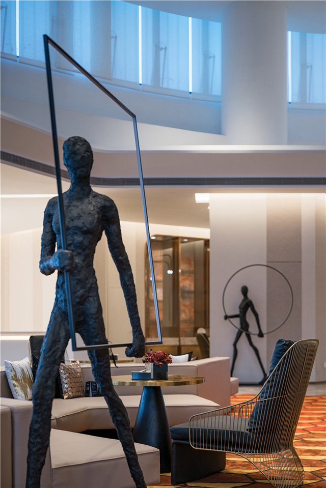 定制的家具回應(yīng)著建筑線條的語匯,與背景的巨幅掛簾十分契合,米白色簡潔純凈,局部點(diǎn)綴優(yōu)雅的寶藍(lán)、黑金,營造出一個(gè)戲劇化而優(yōu)雅的開放式洽談空間。擺設(shè)其中的潮品玩偶、現(xiàn)代人型雕像,同掛簾上繪制的臉譜,碰撞出多元而跳脫常規(guī)的空間魅力,折射出前衛(wèi)不羈的精神。