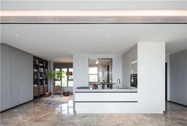 廚房與書房的設(shè)計(jì)以透視手法,大范圍地突出空間的規(guī)整感,以干凈純粹的視效呼應(yīng)整體空間。當(dāng)藝術(shù)融于生活之中,一切落得自然而富有秩序。