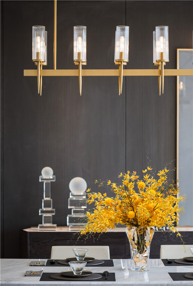 水吧區(qū)的大理石吧臺,以幾何造型的體量呼應(yīng)著建筑體塊,燈具的獨(dú)特造型充滿視覺張力,背景掛畫的色彩呈現(xiàn)不同的層次感,熱烈地歌頌著摩登時(shí)尚的都市生活。