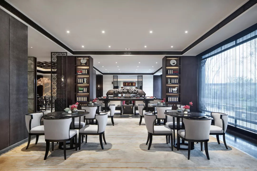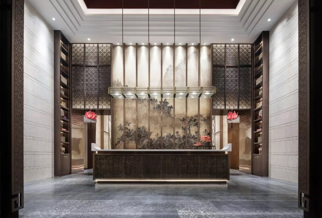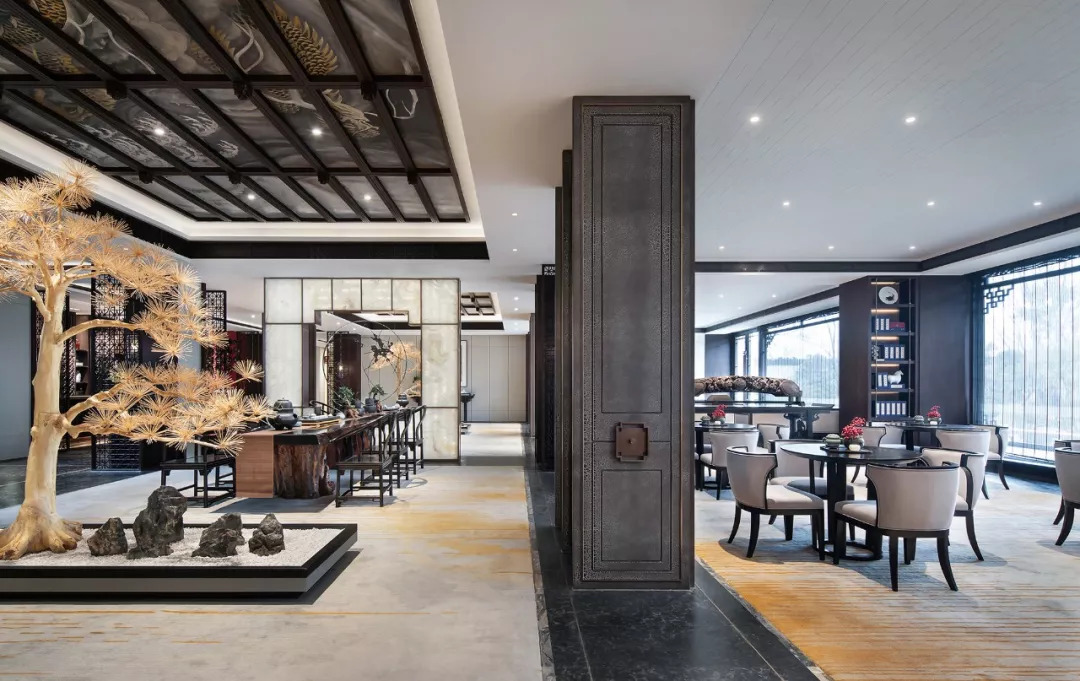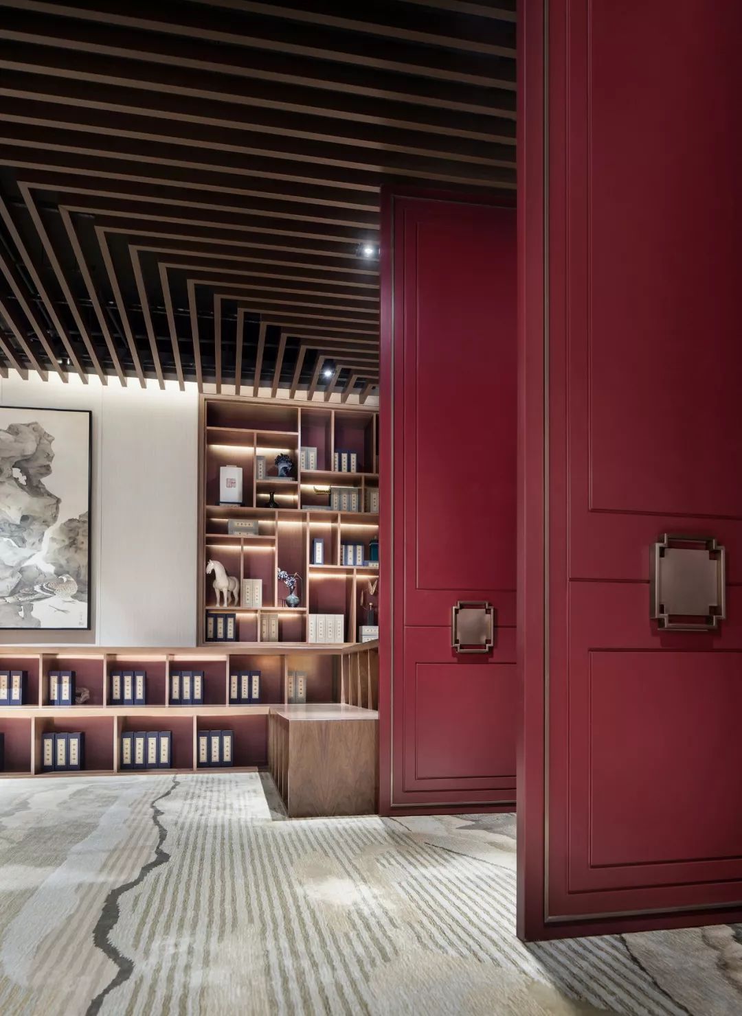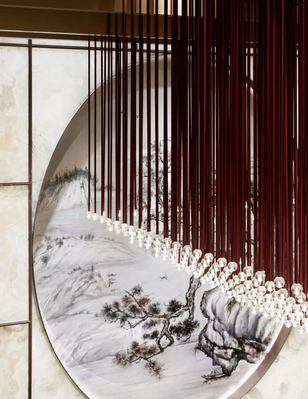 空間游弋于方圓之間,規(guī)整端莊與圓融柔雅糅合;兩側(cè)大型的立框,以現(xiàn)代的手法借景山川云松之靈秀峻美,水波紋理石加以呼應(yīng)點綴,空間升華出廣闊無垠的意境感。大型的銹紅色燈飾垂下,抽象有序的排列,在虛實相生之間跳動著韻律美,空間滿含靈動而峻峭的東方氣質(zhì)。