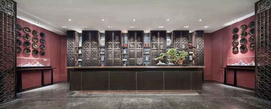 接待區(qū)承襲中式府邸的傳統(tǒng)對稱性布局,呈現(xiàn)儼然大氣的視效。巨幅山水畫在暖光下透著幽幽古意,用寥寥筆墨將自然與歷史書畫。古建的門當(dāng)元素創(chuàng)意性地裝飾于墻上,紋案各異且工藝精細(xì)。各色瓷品、線裝古書、亭臺模型、枯山石小型園景等中式軟飾,營造著一派古雅風(fēng)韻。