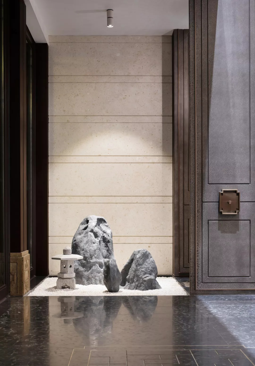 沿著階梯到了二層,設(shè)計在樣板房外構(gòu)設(shè)了一處枯山水的悠然意景,以砂石寫意流水,山石代作山峰,幽幽綠意、疏影橫斜中,涵容著古雅的人文情懷。