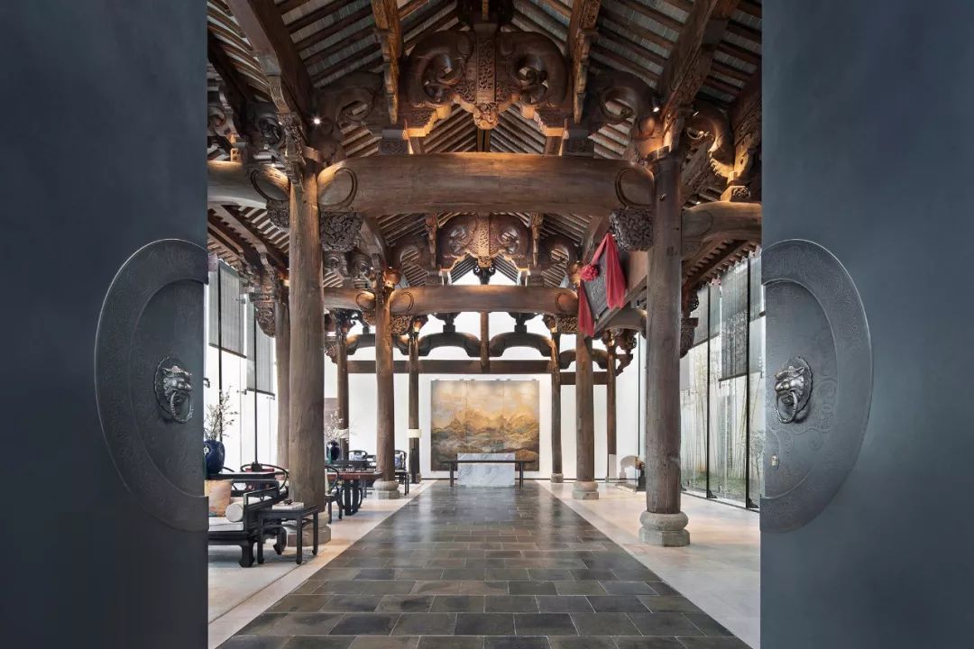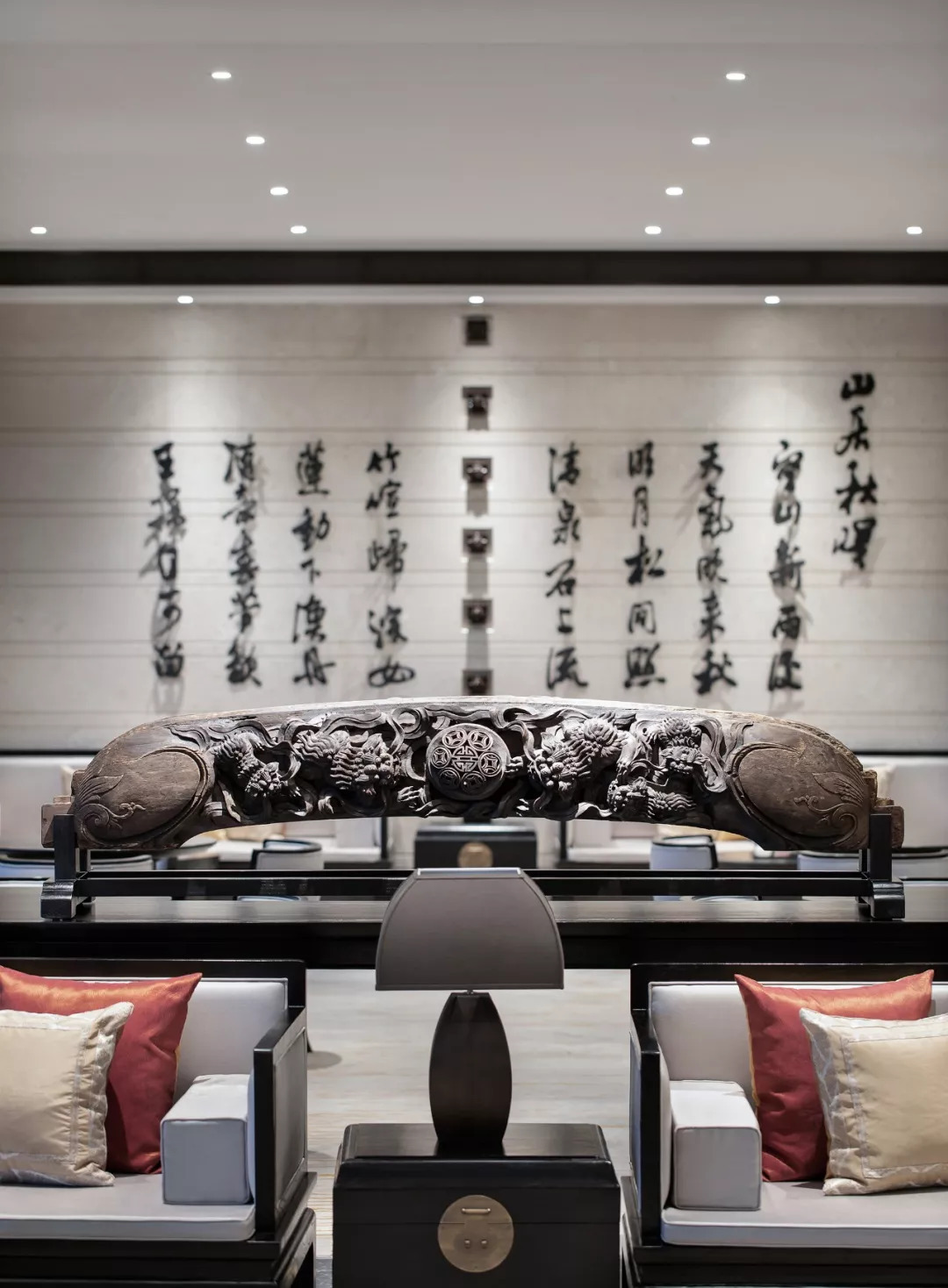 刻著五龍戲珠的木雕擺放在空間正中,展現(xiàn)閩地傳統(tǒng)雕刻藝術(shù)的精湛工藝。象牙白色理石墻面上,設(shè)計以中國傳統(tǒng)建筑藝術(shù)的門當(dāng)元素及書法藝術(shù)構(gòu)圖設(shè)景,吟誦一首《山居秋暝》,空間中凝聚著濃郁的神韻氣質(zhì),詩意綿綿,樂趣陶陶。