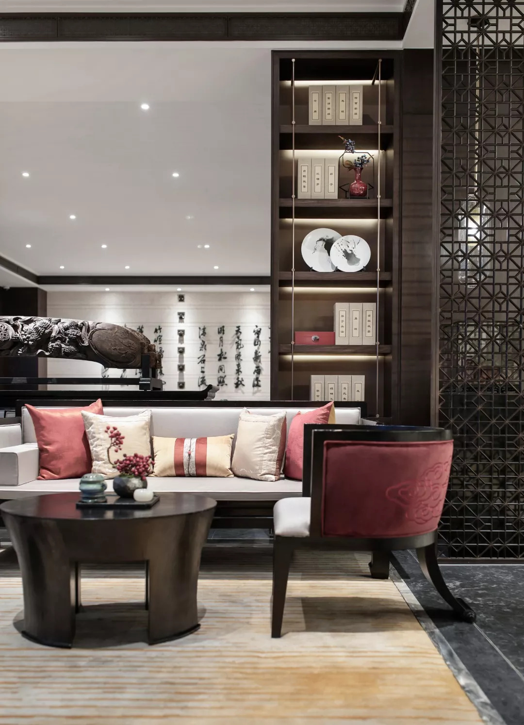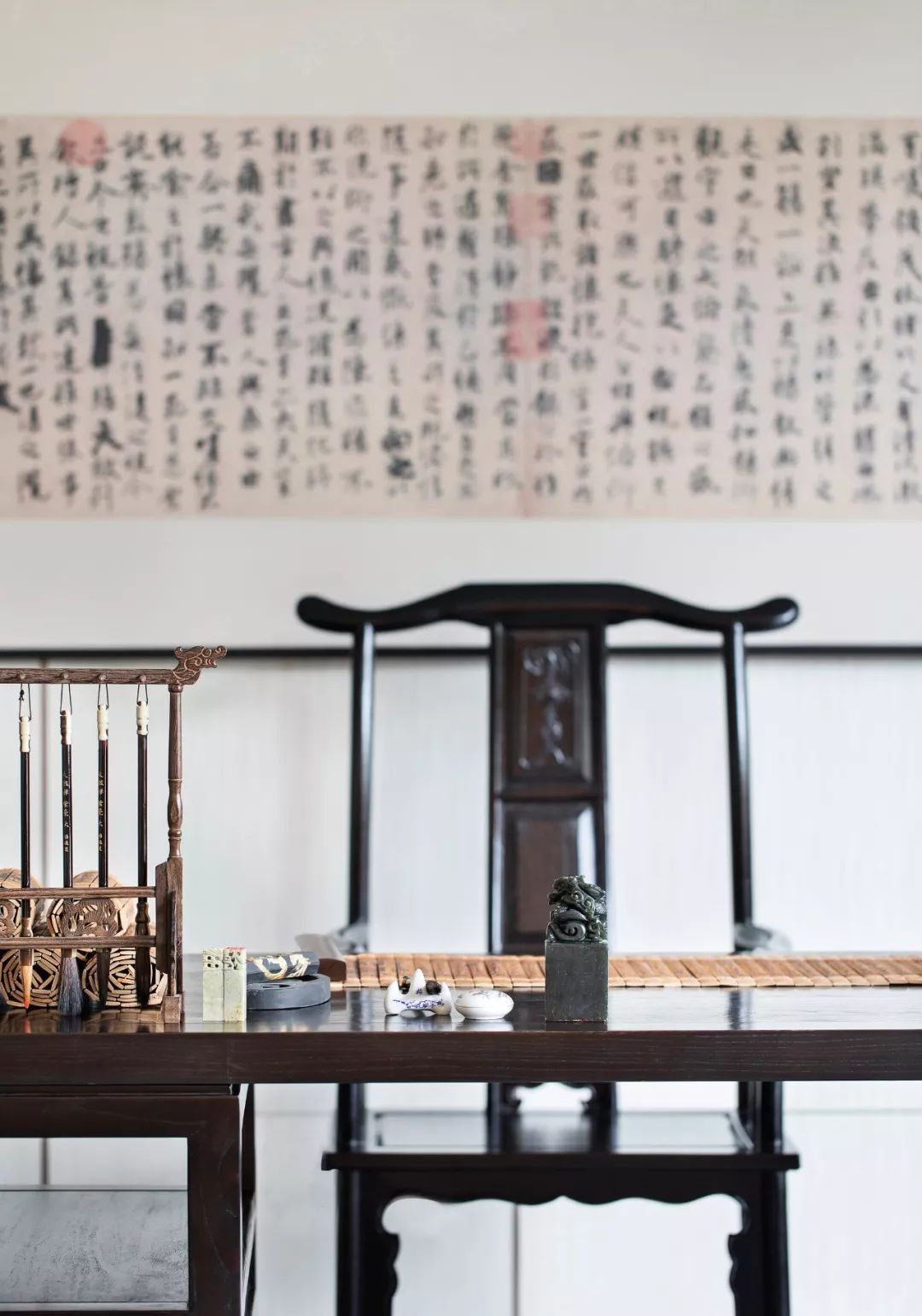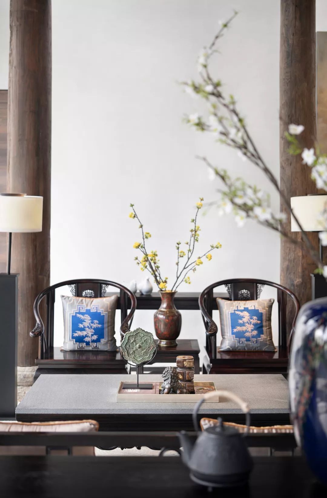 進(jìn)入樣板房前,有一處同樣古雅的休息區(qū)靜候著來賓,簡式玫瑰椅、繡枕書畫、意趣小品共同抒寫著空間落落大方的東方美學(xué),閑雅的意韻舒緩著賓客等候的枯燥心情。