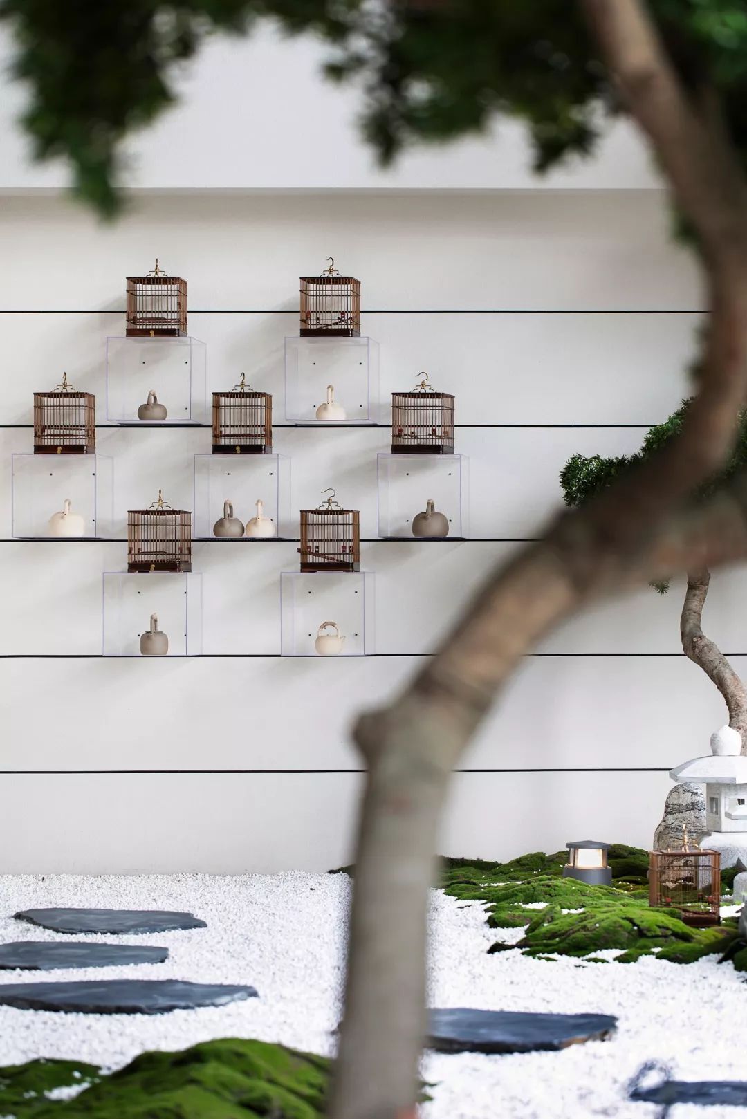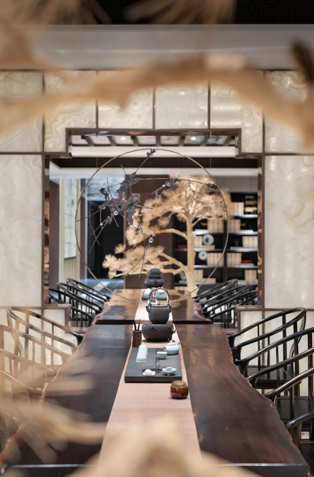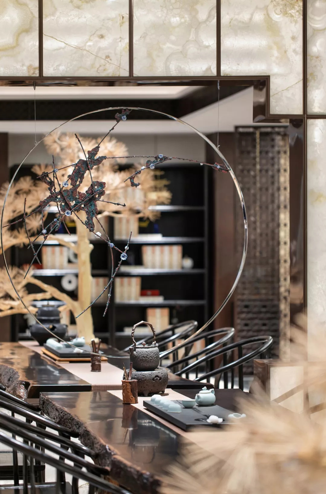 聞茶、望山、聽竹,空間滿含舒愜雅趣之意。定制的水波紋理石墻延續(xù)模型區(qū)的設(shè)計,用纖細(xì)鐵制花藝裝置構(gòu)以借景手法,巧妙區(qū)隔空間之余,可隱約捕捉記憶中文人雅士含蓄而閑雅的人文精神面貌。