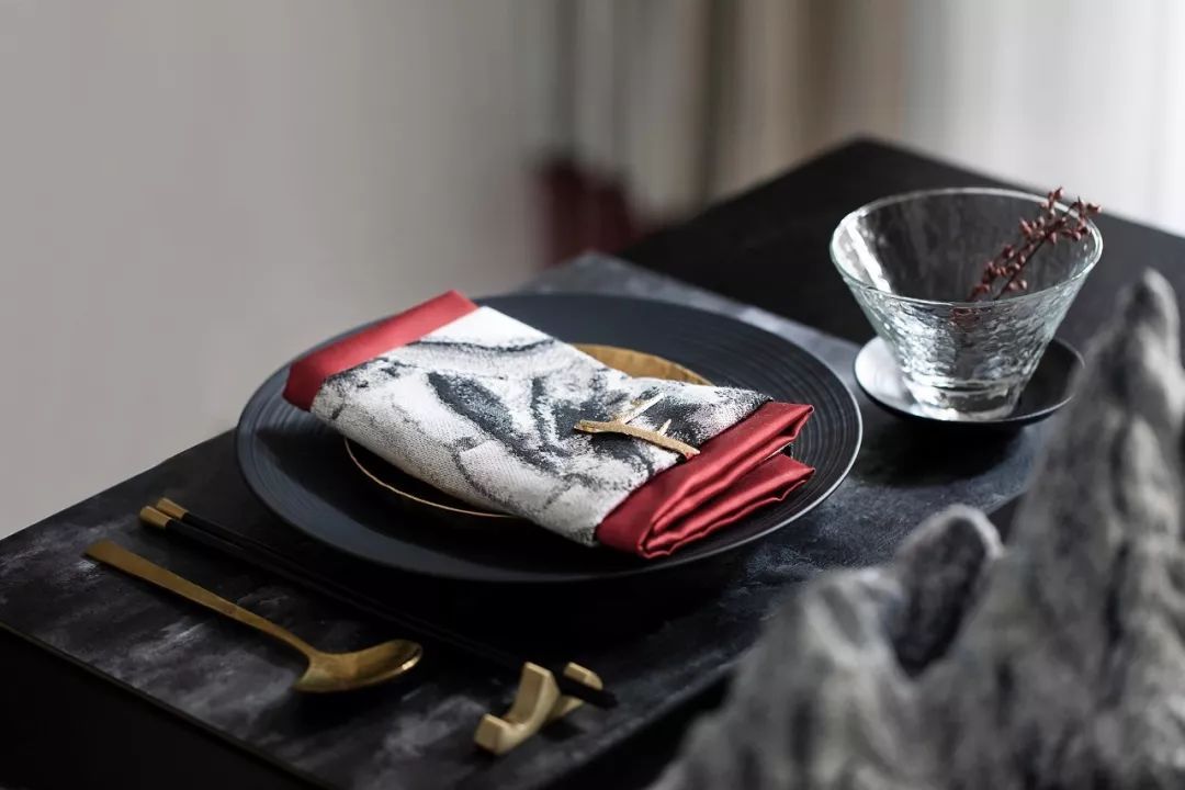 映刻著浮云煙霞的團(tuán)扇做了燈飾,這文雅與精致令人不禁心生喜愛。就餐的禮儀融合了中西形式,典雅的餐具與擺設(shè),構(gòu)設(shè)起端莊大氣的氛圍。