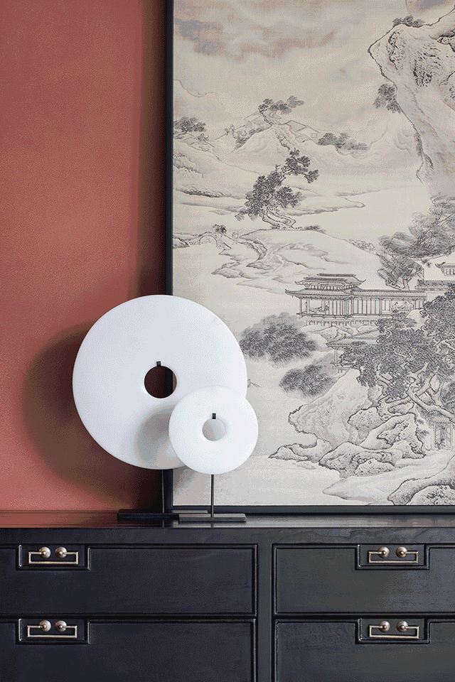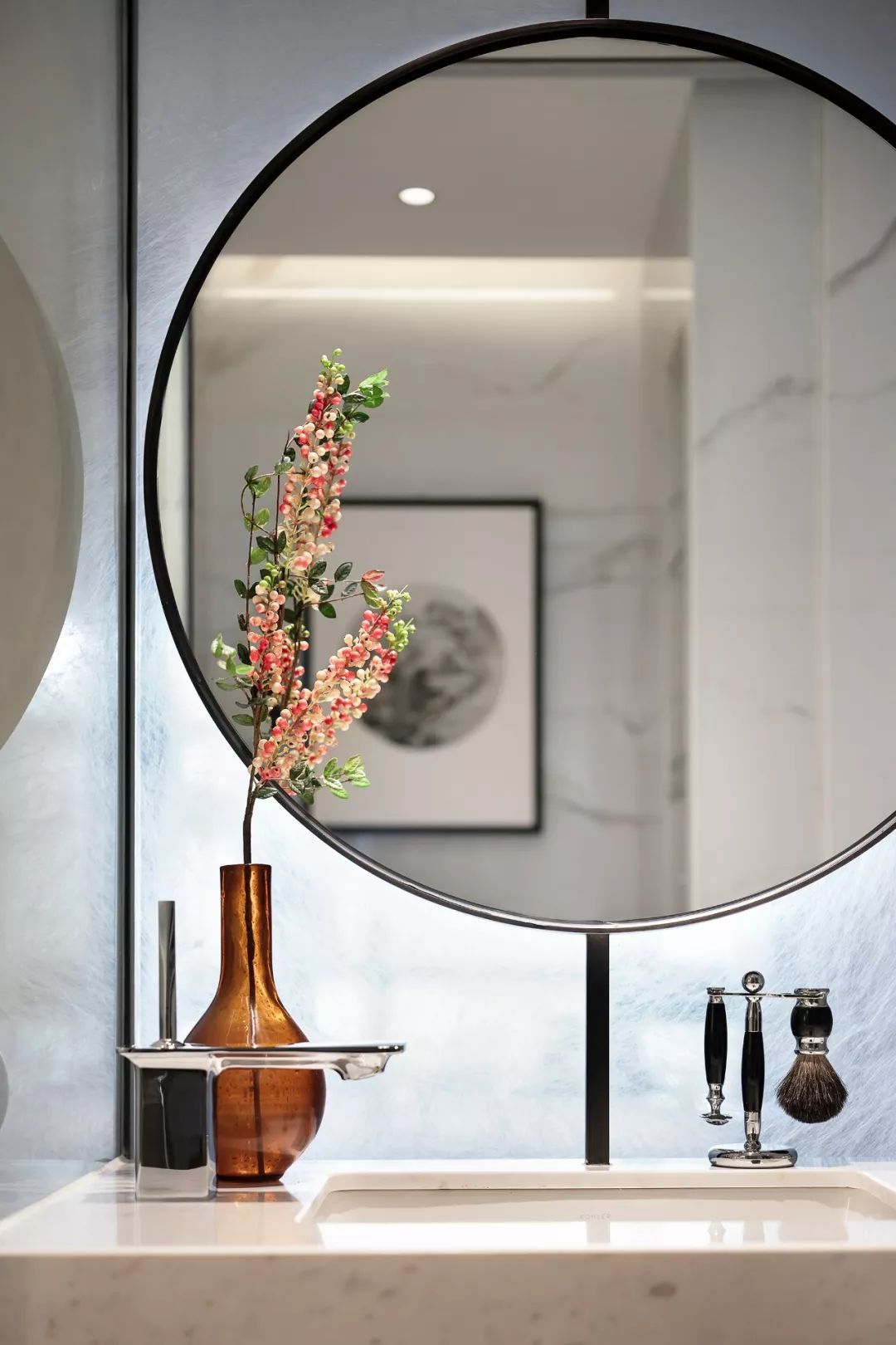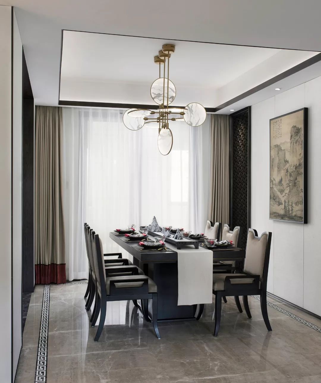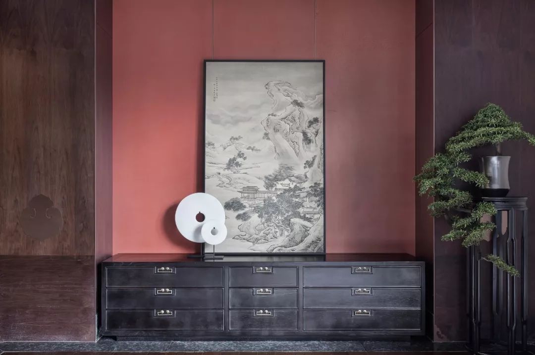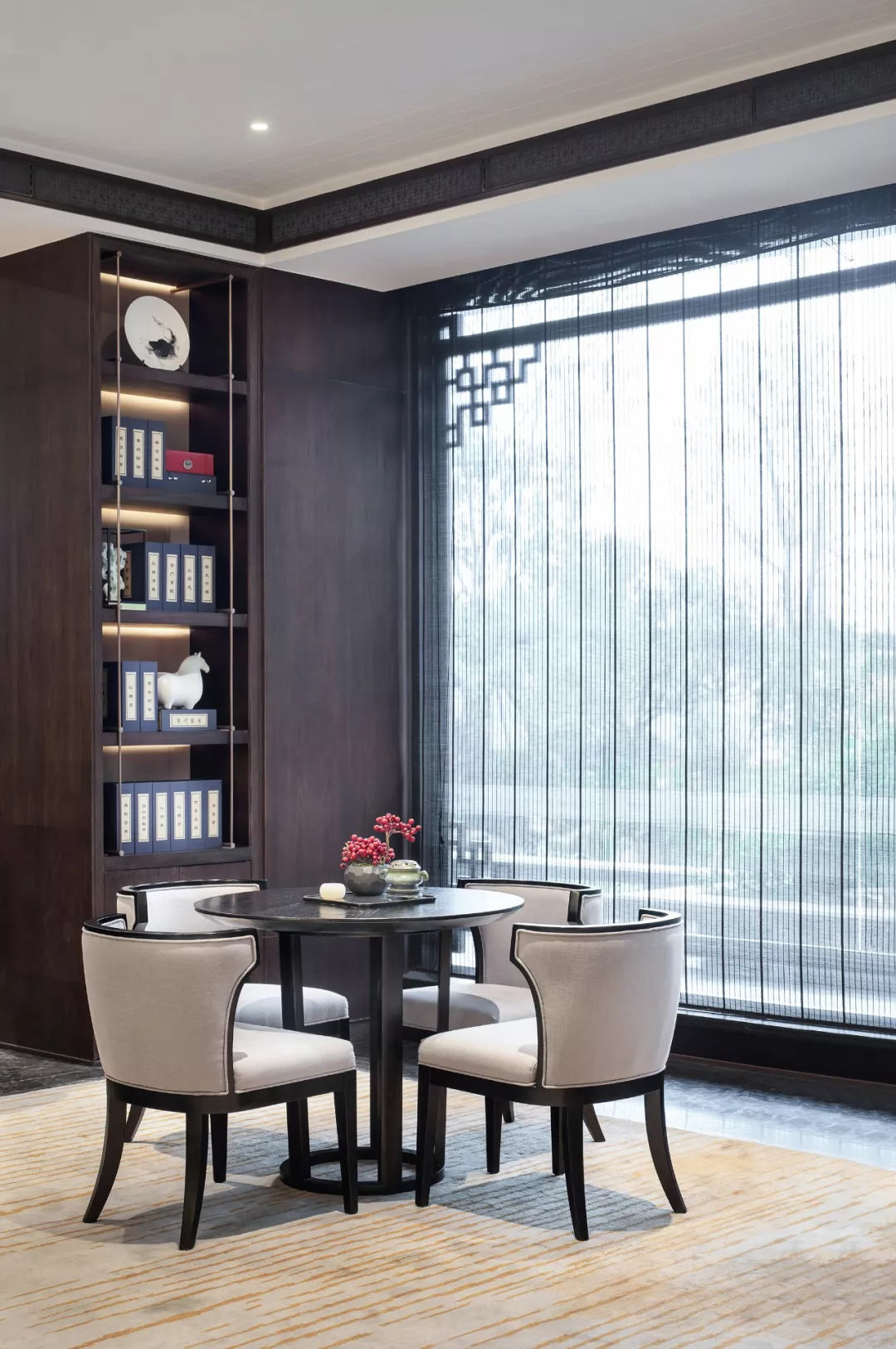 設(shè)計解構(gòu)傳統(tǒng)建筑元素,配以富有雅趣的軟雕飾件、書香茶韻,抒寫中式府邸的秀雅風(fēng)華。中式正統(tǒng)的墨調(diào)與朱紅,在空間中點染映綴,與巖石灰、黛藍(lán)、深煙紅、玳瑁、素白,共同凝練出臻于畫意的境界,呼應(yīng)著山水畫作的詩意綿邈,在有限的空間中營造出無限的東方意韻。