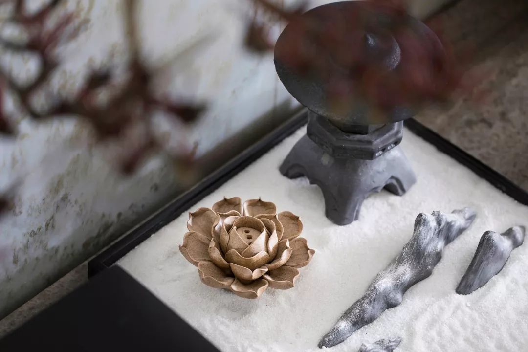 素雅的淺色調(diào)空間中,煦暖的煙靄色在空間中點染著溫潤婉約的情調(diào),身心于此,有著安逸歸寧的從容。新中式實木桌椅、屜柜與現(xiàn)代簡約軟包和大理石材質(zhì)融合相映,迎客松盆栽、巧致印章、纖細(xì)花藝、山水畫、刺繡手作、枯山石微縮小景等傳統(tǒng)東方元素裝點著空間,讓傳統(tǒng)中式的情韻得以延展開來。