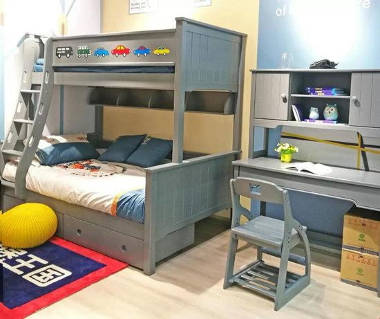"Elegant bedroom set Bunk bed"同為升級產(chǎn)品,是經(jīng)典的雙層床結(jié)構(gòu),顏色采用流行莫蘭迪色高級灰,足以百搭任意風(fēng)格的兒童房。護(hù)欄迎合孩子對“卡通汽車”的喜愛,親近感十足,護(hù)欄可根據(jù)孩子的喜好,自由變換。