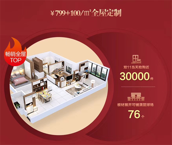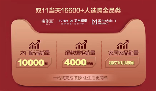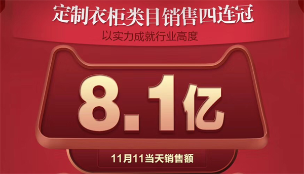 據(jù)索菲亞發(fā)布的數(shù)據(jù)顯示,雙十一當(dāng)天其銷售額達8.1億,位居天貓美家及定制衣柜類目第一名,下午15時25分即超越2017年雙十一總銷售額,銷量比去年增長44%。大家居強勢霸屏,799系列爆款衣柜賣出22000件,¥799+100㎡全屋定制搶購近30000件,超過16600人選購全品類,其中米蘭納木門新品銷量達10000樘,司米櫥柜銷量達4000延米,家居家品銷量超過10月總額。