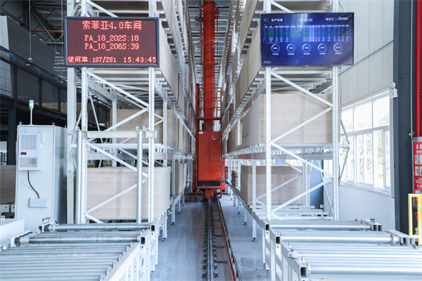 “用科技重新定義生產(chǎn)”,是索菲亞對黃岡工業(yè)4.0 車間的定義。4.0 車間實現(xiàn)原料板件從智能立體原料倉出發(fā),經(jīng)過開料、封邊、打孔、分揀、打包等工序,全部由機械臂、智能物流系統(tǒng)等自動完成,全程不落地、不經(jīng)人手。