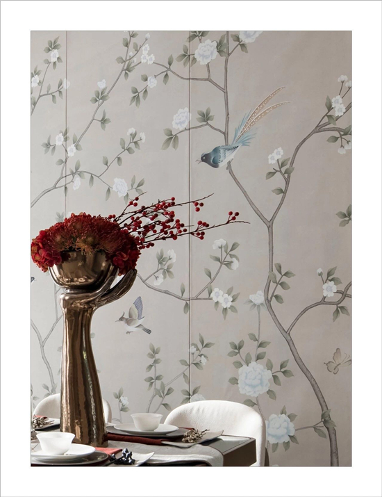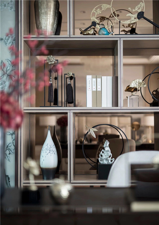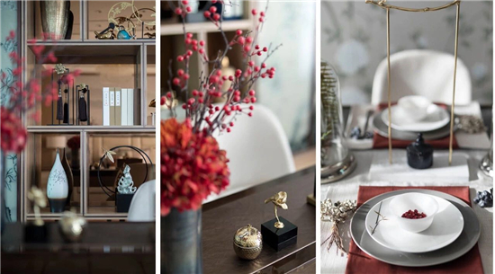 餐廳延續(xù)著清雅的灰白設(shè)調(diào),沉穩(wěn)的莧紅色與清新的冷綠組合,為靜婉的空間蘊育一種穩(wěn)而不沉的生動韻味。背景墻上的植物花鳥藤蔓,勾勒一個靈動、雅致的空間意境,為每日的用餐時光增添趣味和舒然。