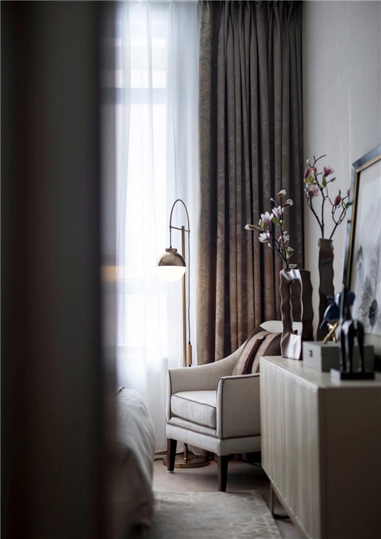 設(shè)計師懷揣著“讓每個空間都能享受充裕的自然光浴”的深沉執(zhí)念,空間皆是向著光而生!明快的客廳陽光流瀉一地,透過薄薄的白紗,窺見戶外厚厚的白雪與陽光擁抱、交融,寬舒、安徐的柔軟感涌上心頭。在白、灰的安靜基調(diào)里,用些許的暗紅和胡楊林色點到即止,竟滋生一絲動人心弦的喜悅來!