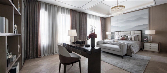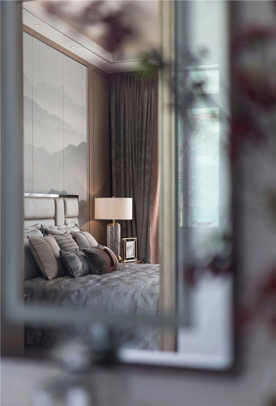 對臥室的處理則更為簡練純粹,高級灰的主調(diào),調(diào)和降低了飽和度的胡楊林色,為睡眠創(chuàng)造一個澄澈明凈的安舒之境。而床頭背景墻上大幅“灰色云海之作”,層疊出高闊起伏的大氣,表達一份豁然開朗的心情。