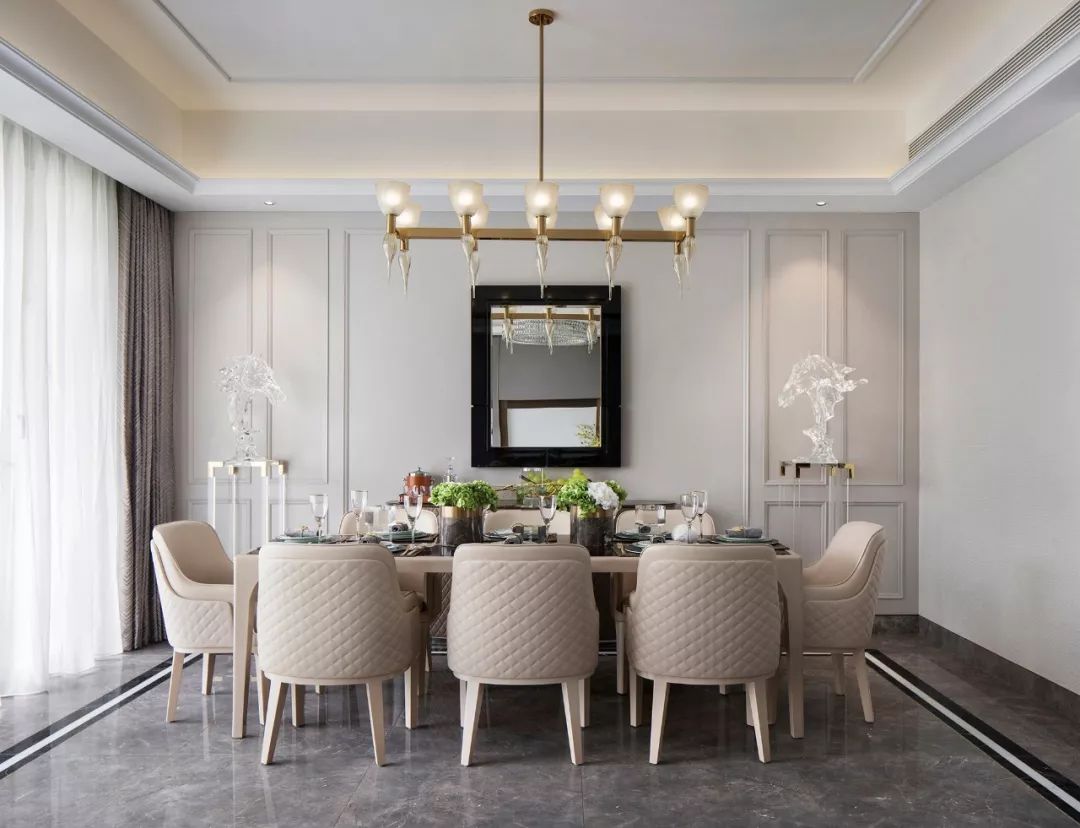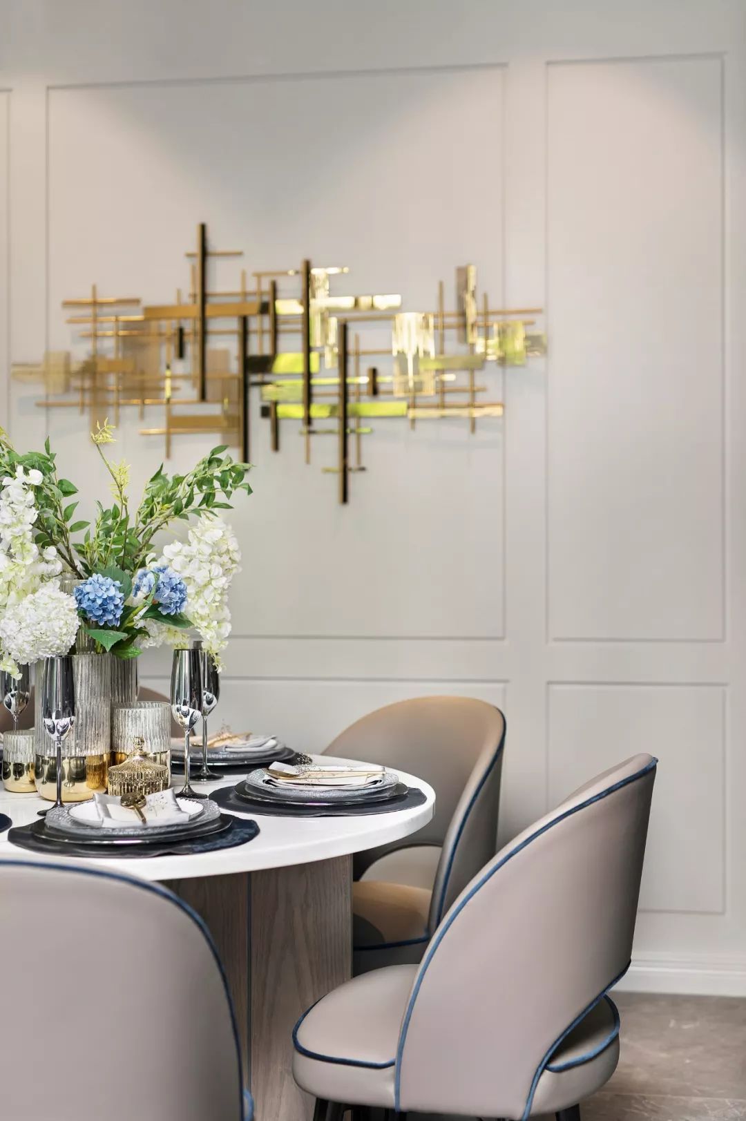半開(kāi)放式的廚房設(shè)計(jì),自由切換中西廚模式,小型中島柜補(bǔ)充更多的收納空間,家人在這里一同料理,加載出更多親昵的生活場(chǎng)景。餐廳以圍合的簡(jiǎn)式餐桌椅、純凈的水晶燈飾、精致的餐具與花藝,打造溫馨喜樂(lè)的就餐氛圍與生活的儀式感。