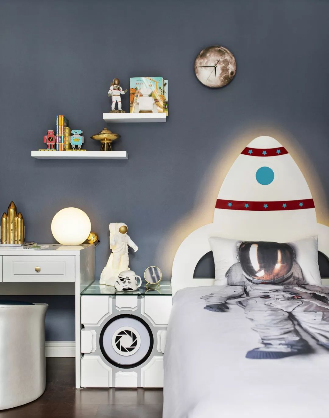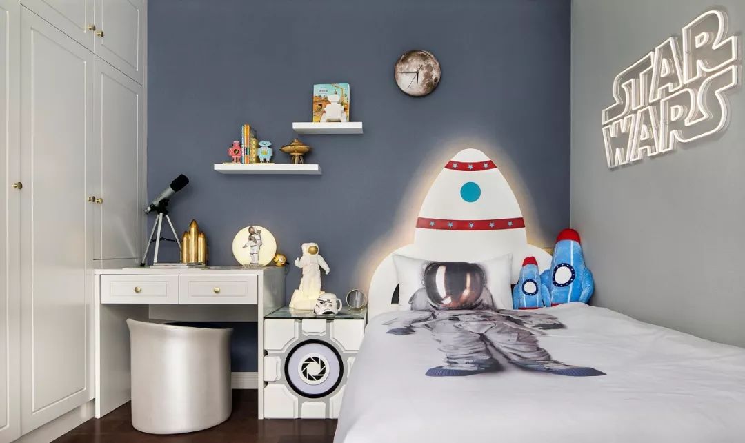 兒童房是宇宙太空的科幻主題,帶有灰調(diào)的藍(lán)色在空間中以豐富的層次、不一的功能呈現(xiàn)展演,更為耐看的陳設(shè)色調(diào)可以經(jīng)得起小男孩心智的成長(zhǎng)變化。隨處可見(jiàn)的STARWARS周邊、月球造型鐘表和燈、太空艙床頭柜與發(fā)光背景,搭載著小朋友稚嫩而精彩的夢(mèng),空間變得美好而富有童趣,是童年最為美好的生活饋贈(zèng)。