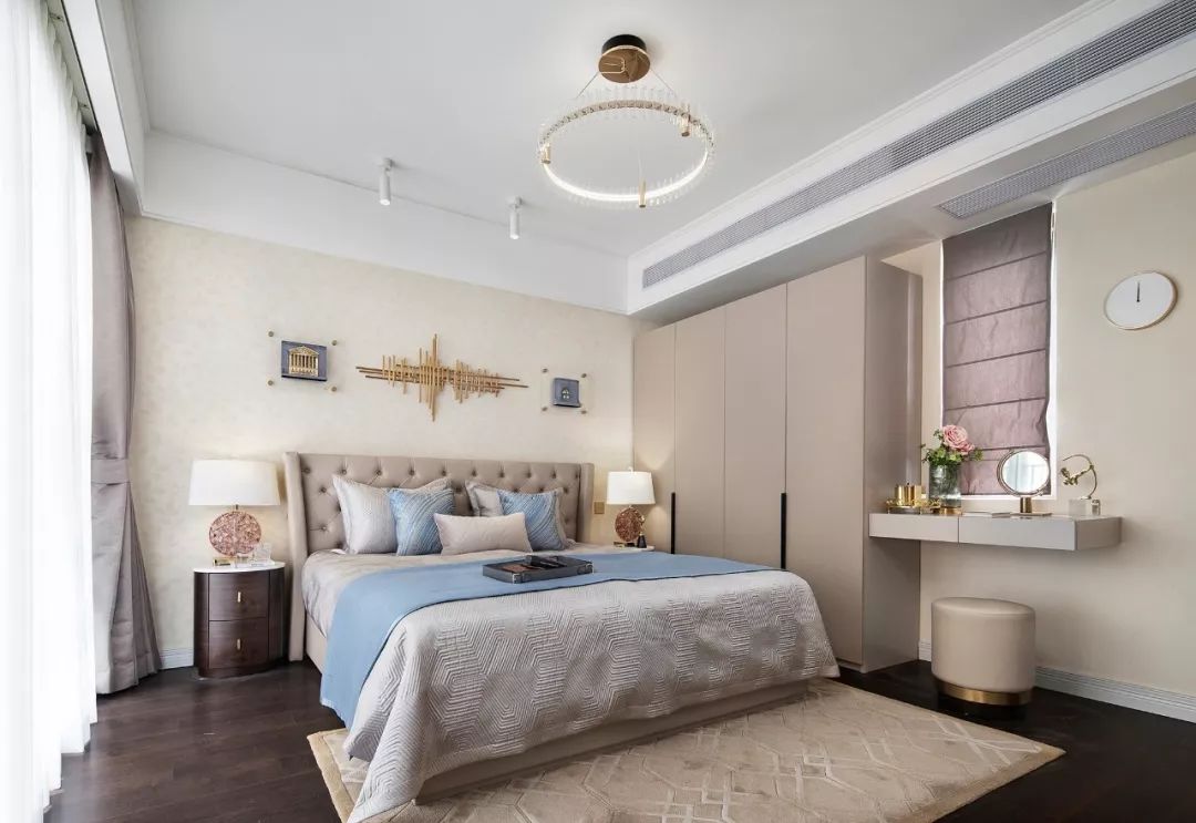主臥設(shè)計(jì)選用亞棕色的基調(diào),渲染著雅澹的居室氛圍,木質(zhì)、合金、軟包材料的運(yùn)用增加了質(zhì)感的豐富性??臻g內(nèi)的美感由飾面上的紋理一層層地延展開(kāi)來(lái),仿佛協(xié)奏著一首古典鋼琴樂(lè)曲,曼妙而舒緩身心。