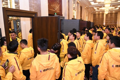 2019年2月26日,德盾發(fā)布會在武漢洲際酒店舉行,全國經(jīng)銷商代表不辭辛苦的從全國各地趕過來,都想跟上新年這一波浪潮。舞臺前面有一大片顯眼的紅色蓋布,蓋布下面是新品樣品門,無疑是今天的亮點。