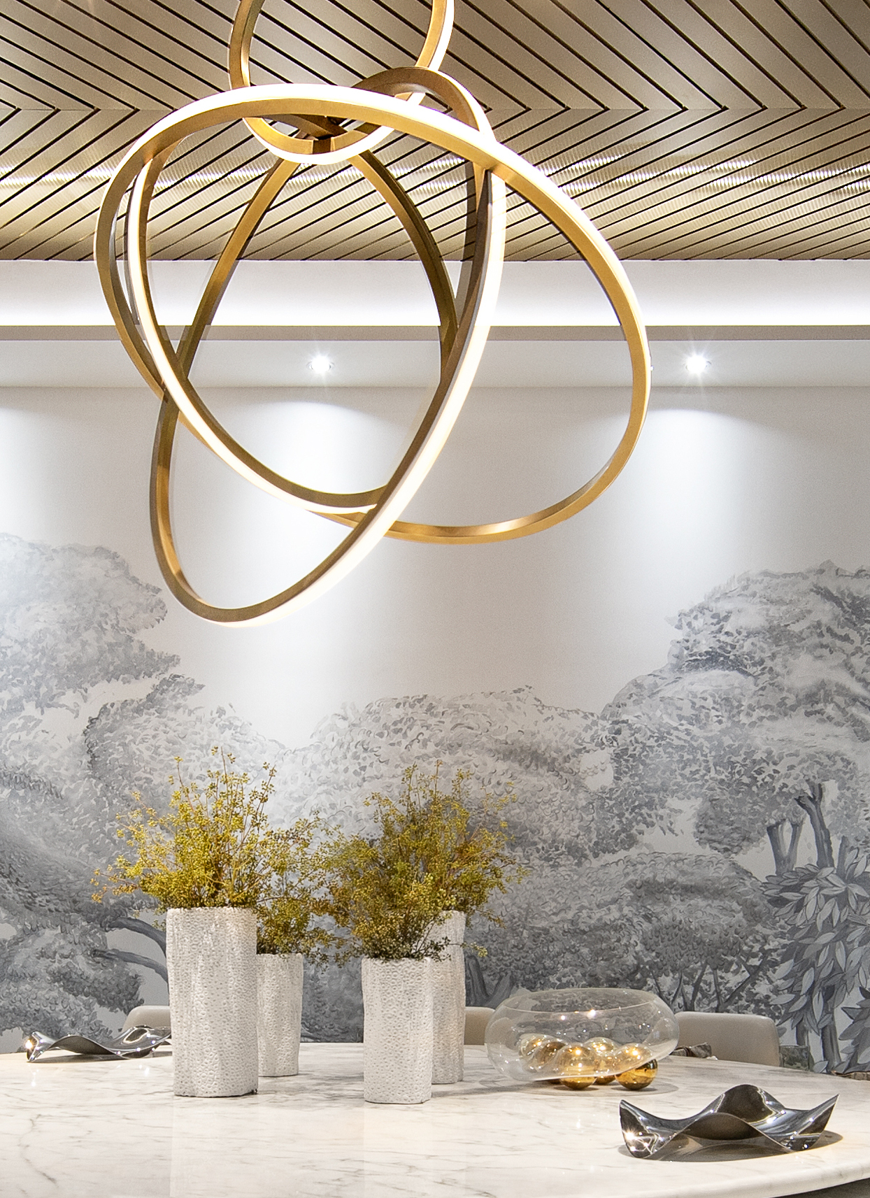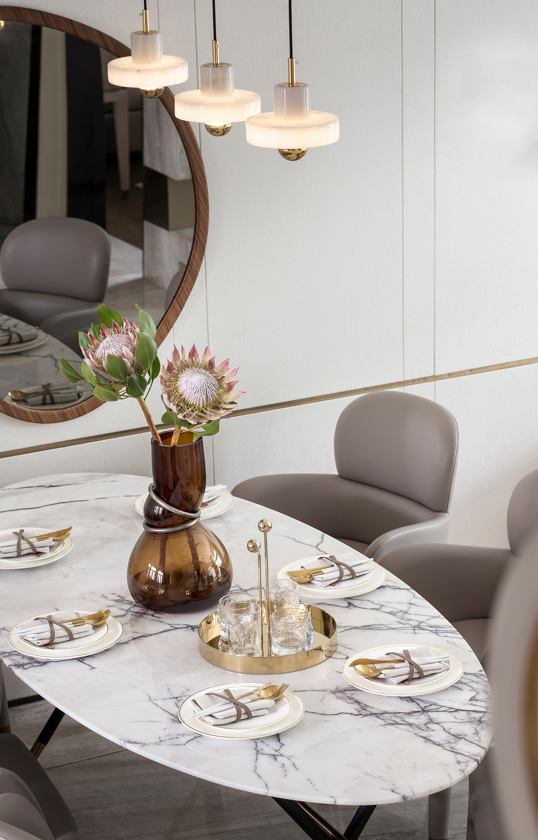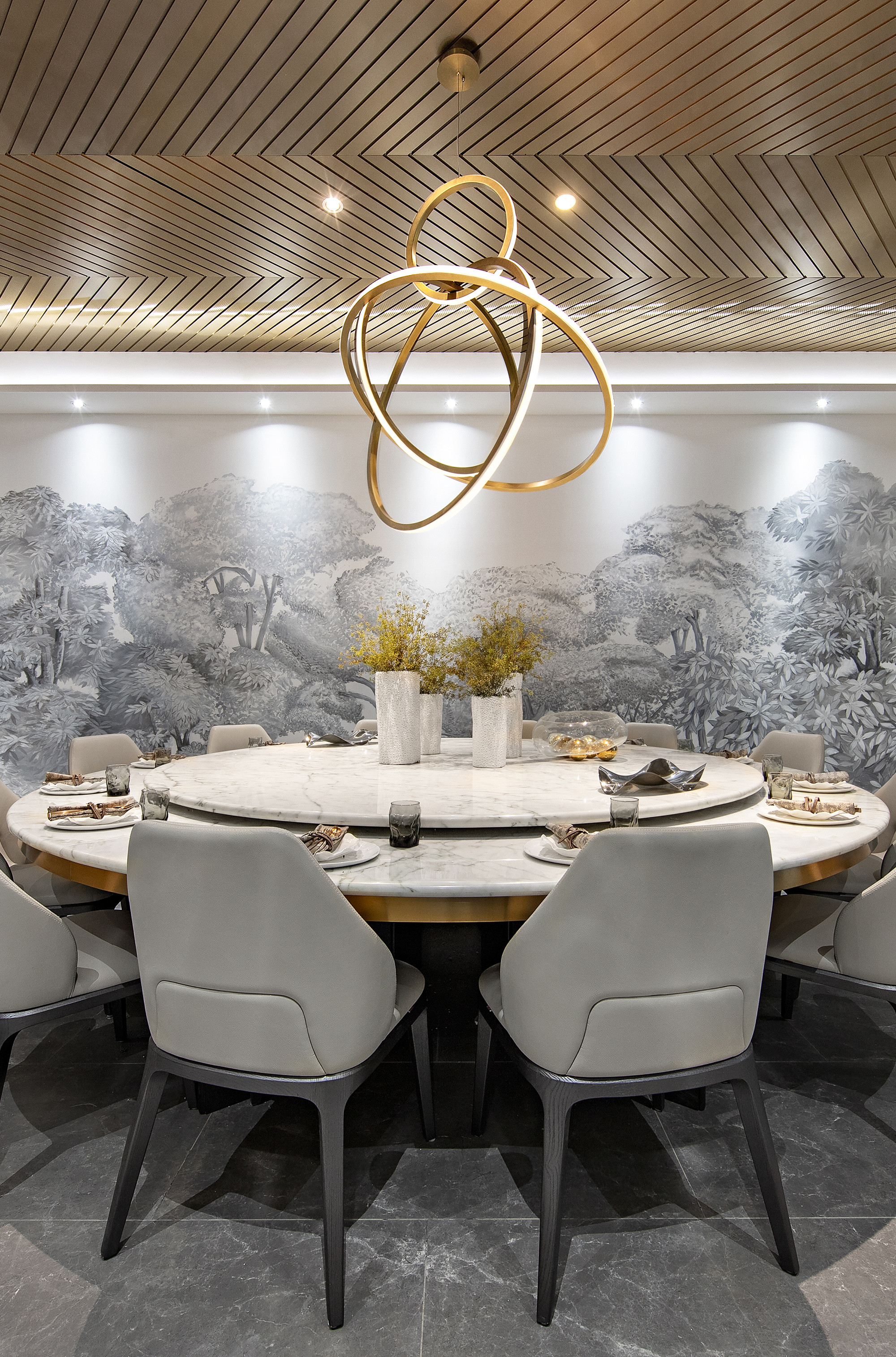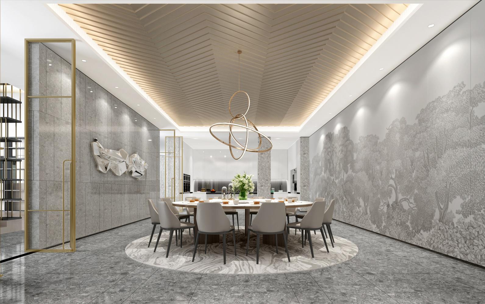 唯有包羅萬象的色彩才能承載自然的豐厚,宴客廳以大地色為主色調,如行星般游弋半空的吊燈,大面積極致動人的手繪墻體紋樣與天然翡翠白玉石臺面的宴會桌,共同塑造了空間的意境之美,吐納生活的悠然。(圖28)