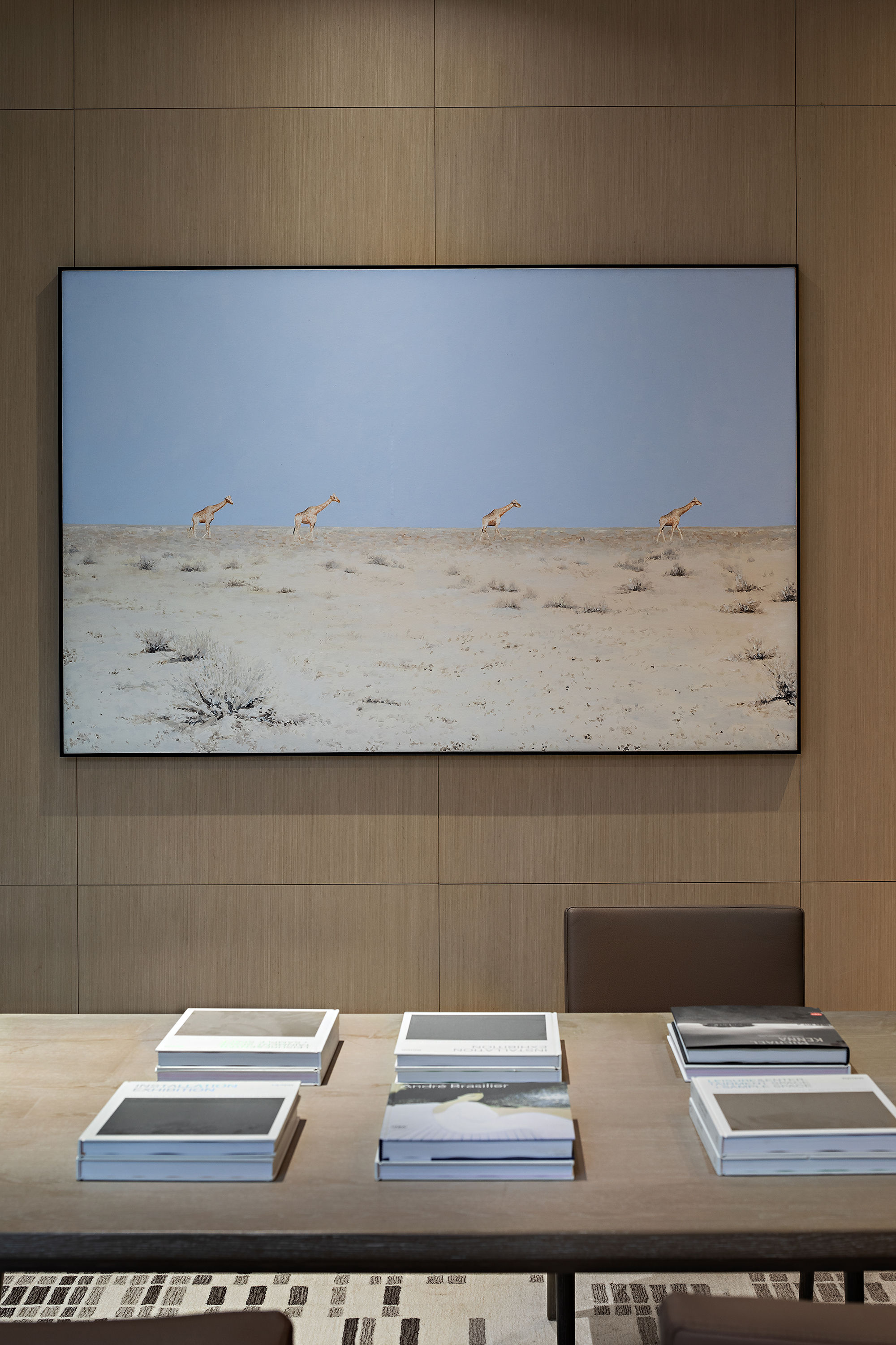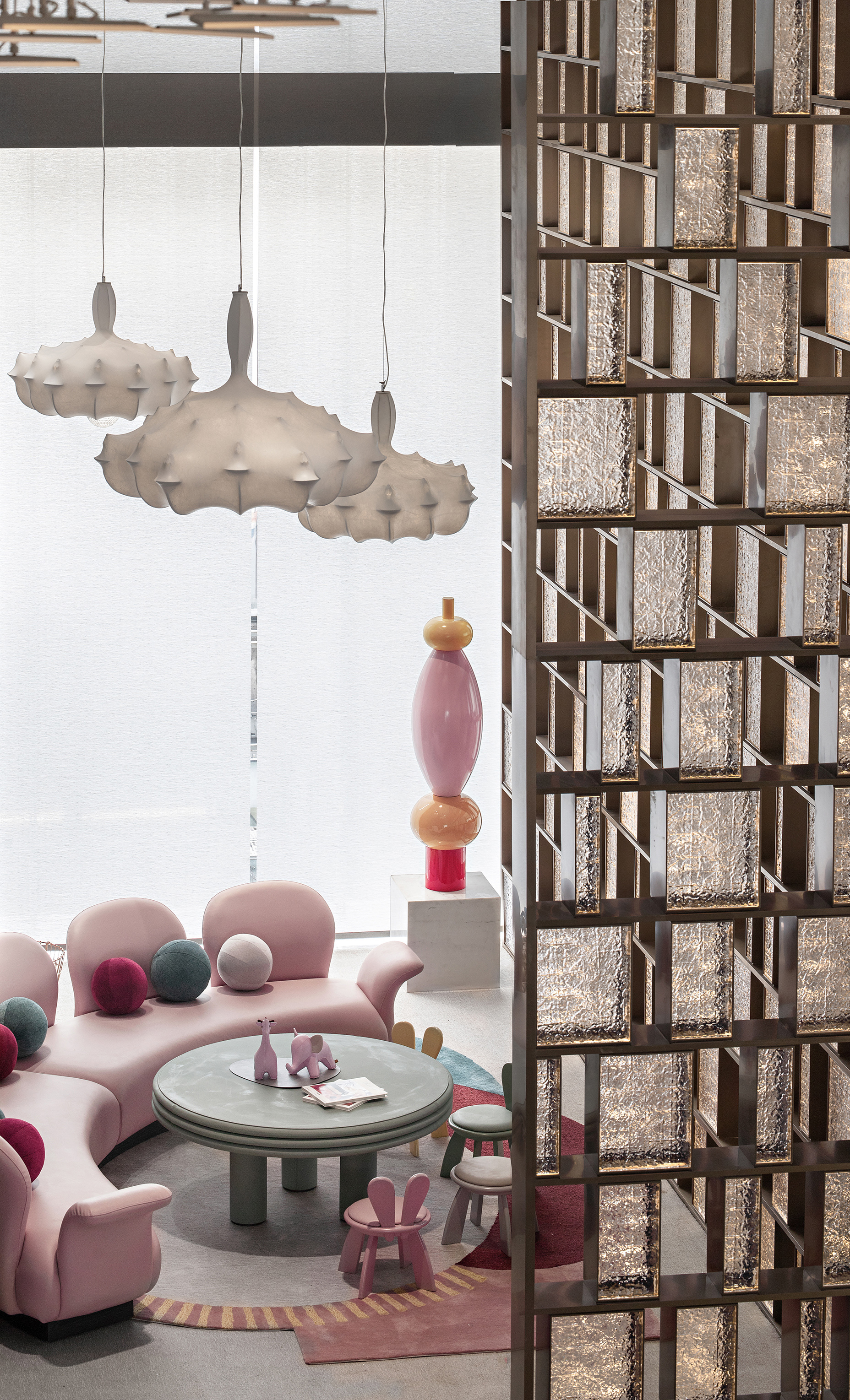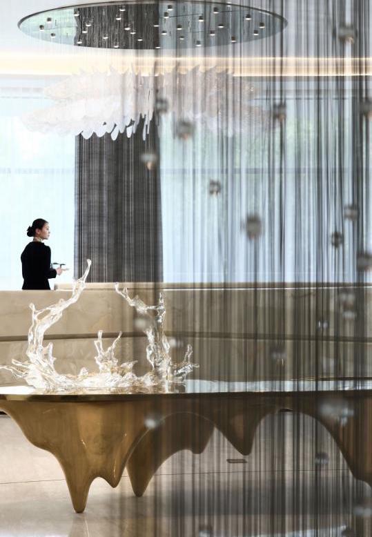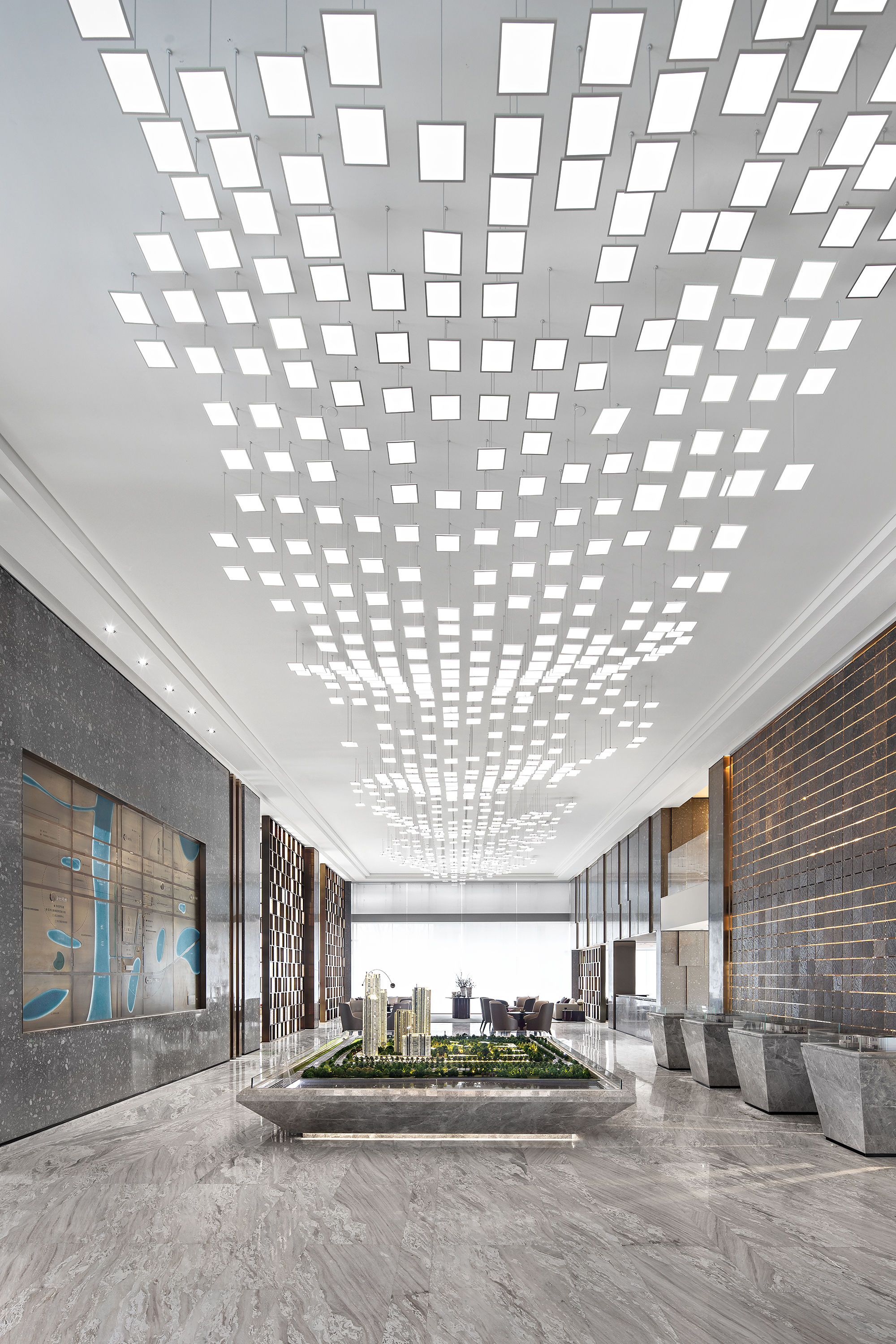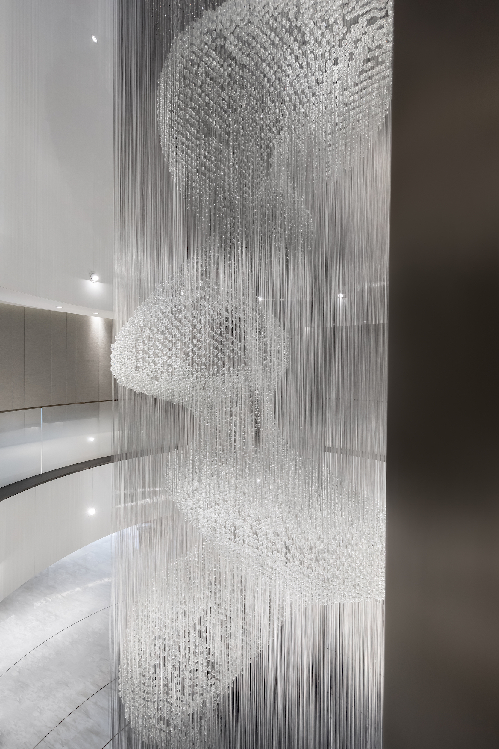 半城江色,半城湖光,步入沙盤區(qū),舉頭便能望見國內首次運用在會所空間的動態(tài)藝術裝置——長約27 米寬6米的流光藝術裝置《沉·浮間》,這個從河流中汲取靈感,將自然的節(jié)奏、流動、形態(tài)和變化表現(xiàn)在這個充滿活力的流光雕塑之上。它們錯落交疊,輕盈夢幻,漂浮在半空,像晴日里的江面微波粼粼的樣子,也寓意大自然的川流不息。