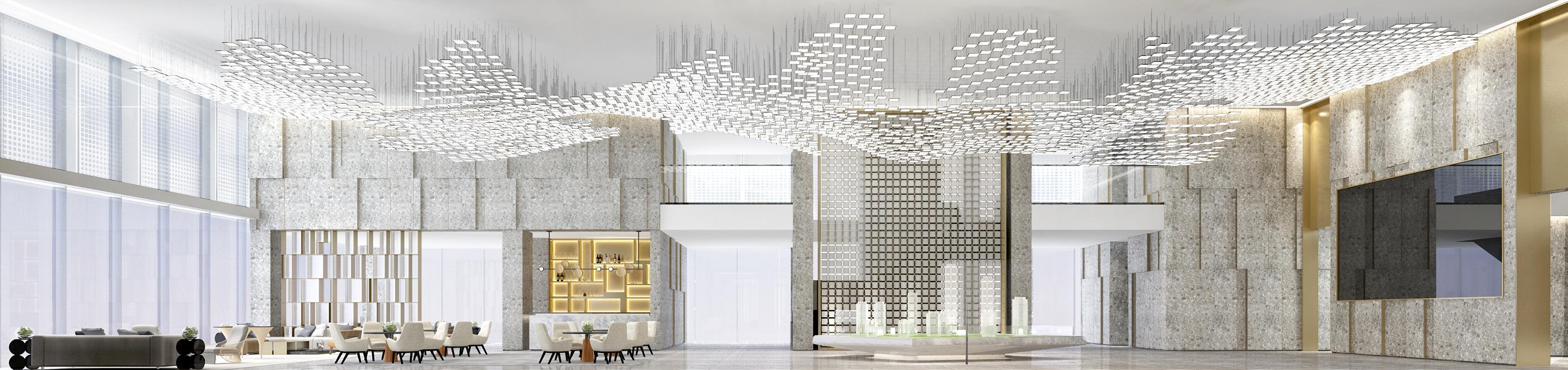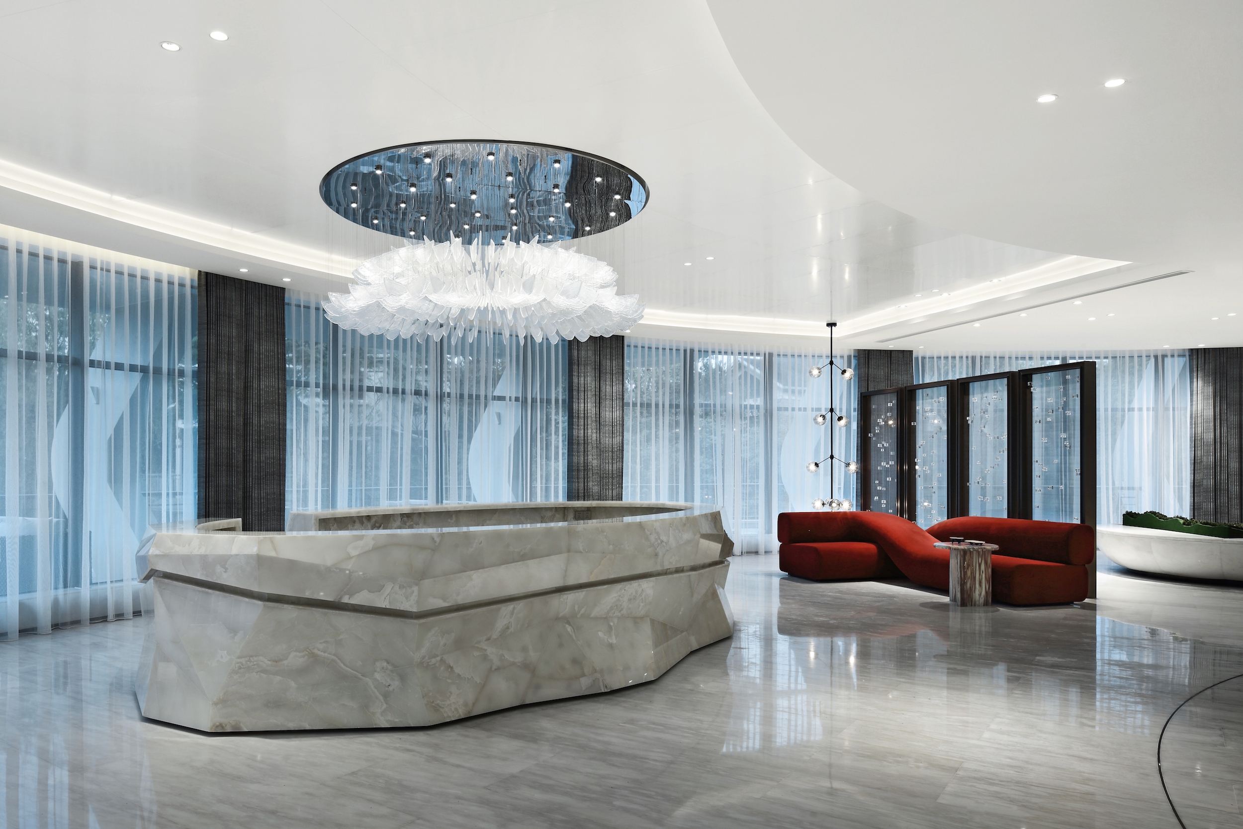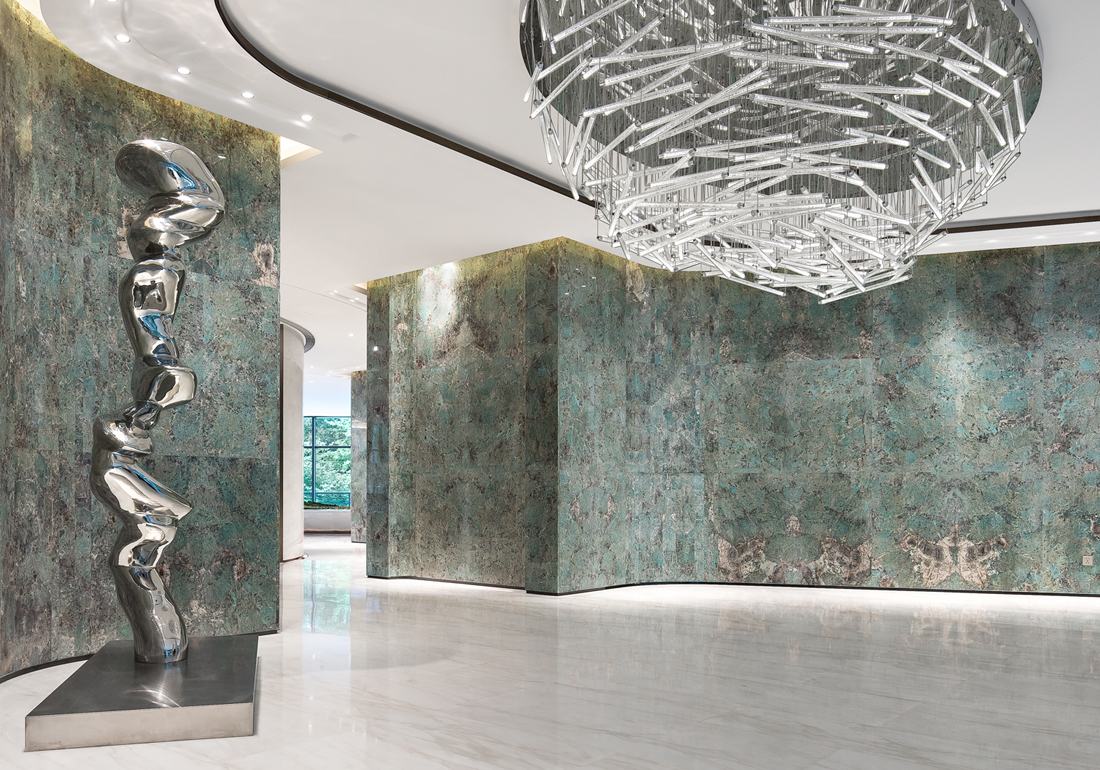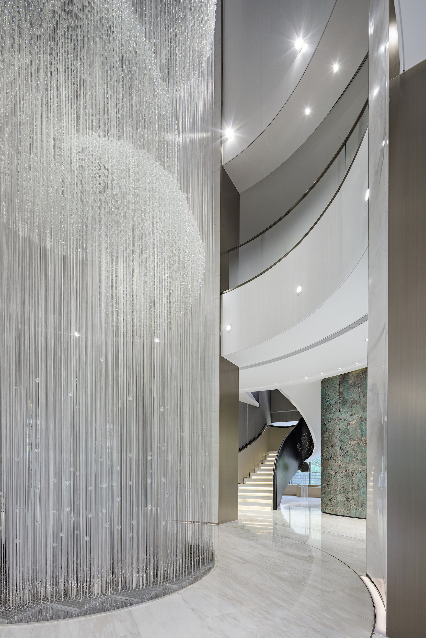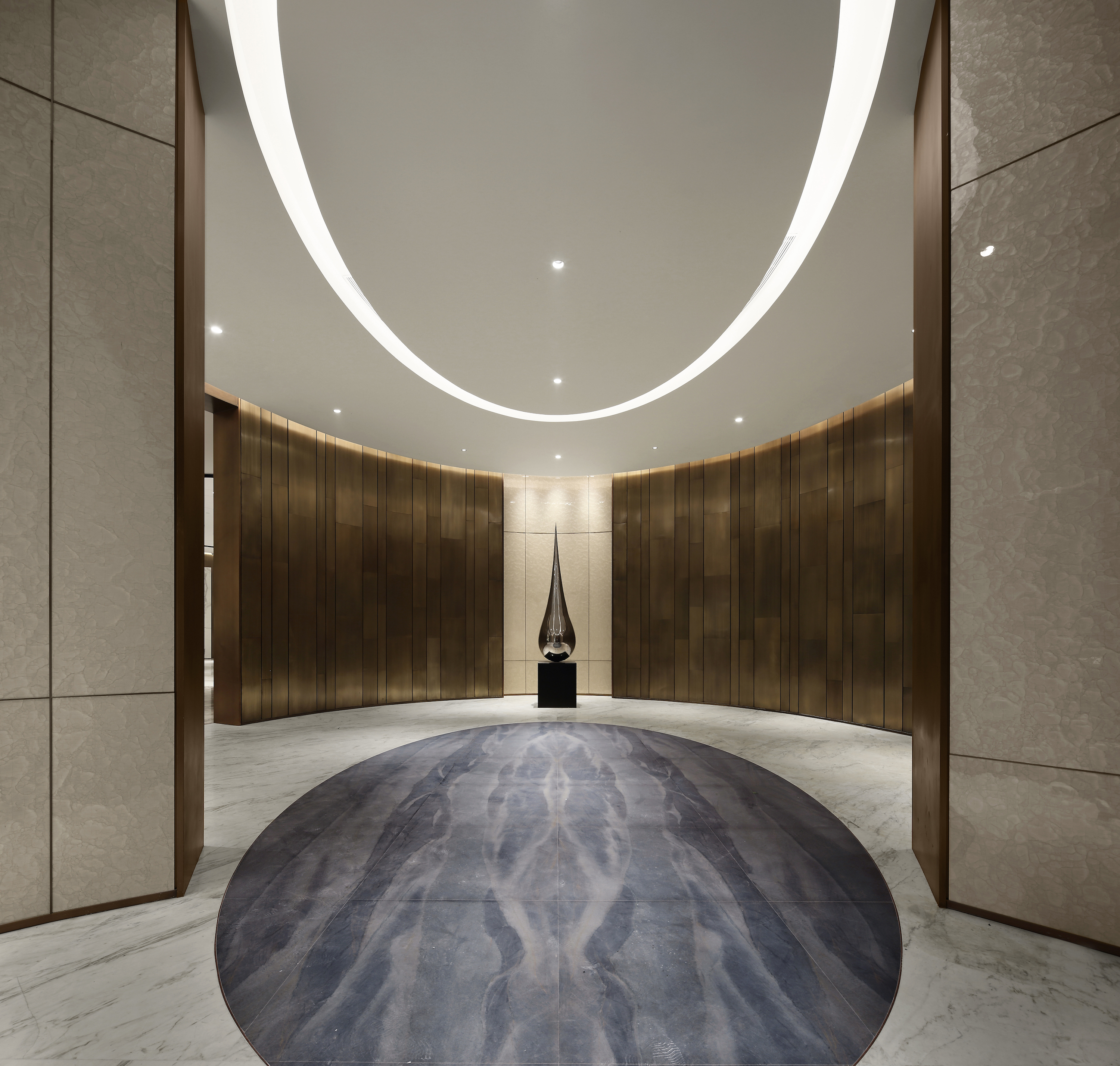 整體設計造型以浪潮為元素,用現(xiàn)代的手法表現(xiàn)出其獨特的剛毅與柔軟并揉,石材、金屬、玻璃在曲線下呈現(xiàn),將剛柔并濟完美詮釋,自然之形,現(xiàn)代勾勒。深入其中,目光不自覺會被環(huán)繞著旋轉樓梯的電梯所深深吸引,它更像是一個用銅元素打造的裝置藝術品。抬頭仰望,大型主題藝術吊飾”飄”,與地面水波紋石材的呼應,形似那卷云擁雪的潮頭,趣意盎然,一動一靜,引導人們漸入佳境。