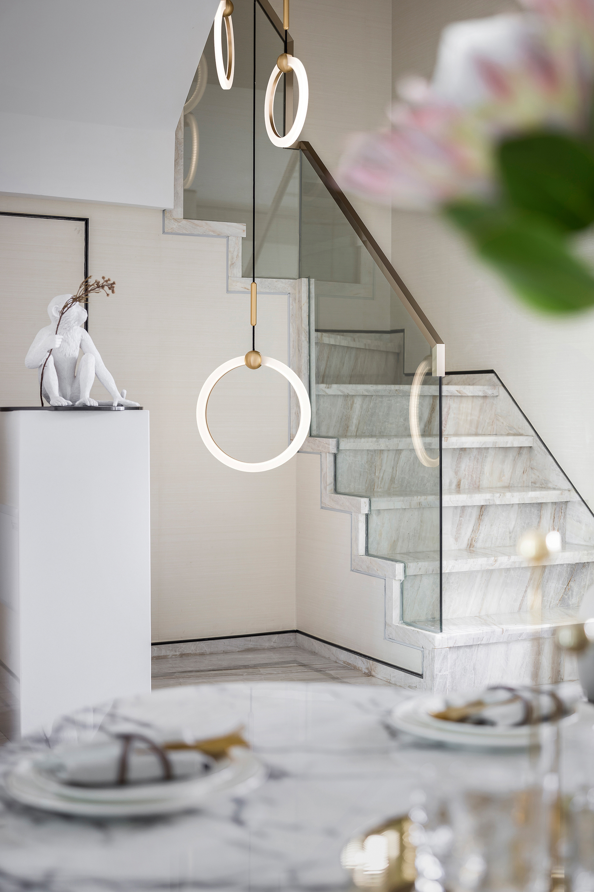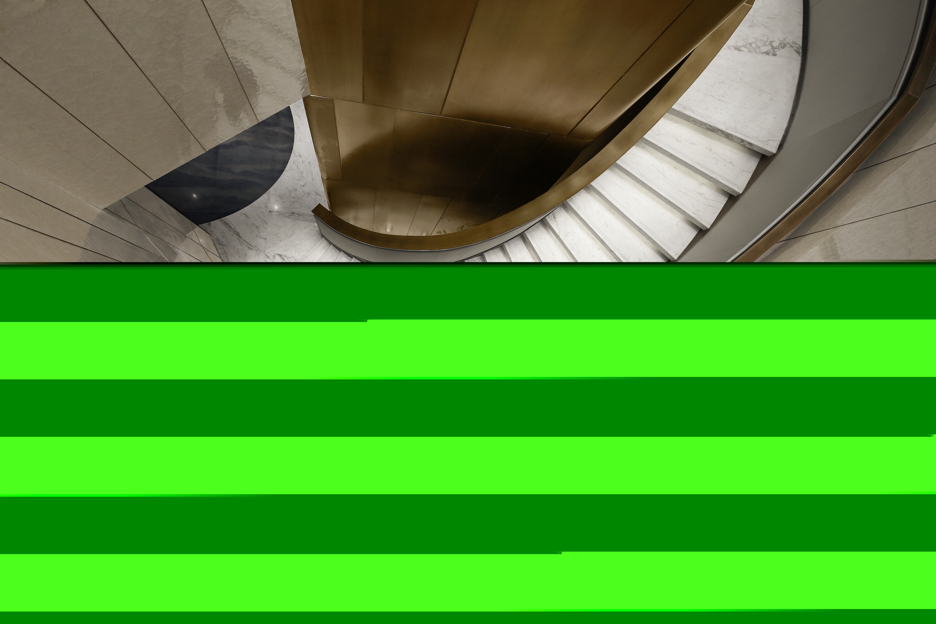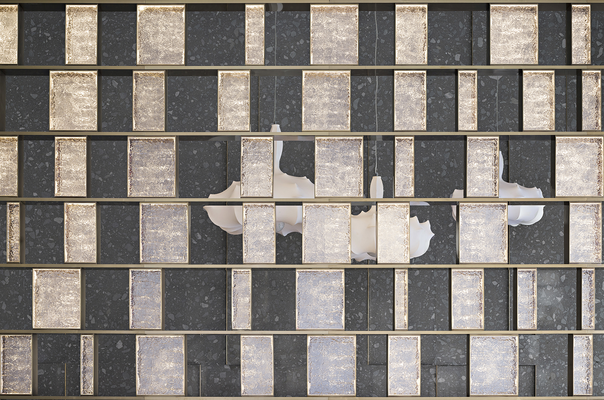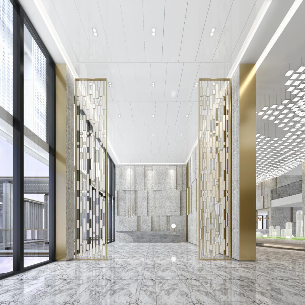 整體設計造型以浪潮為元素,用現(xiàn)代的手法表現(xiàn)出其獨特的剛毅與柔軟并揉,石材、金屬、玻璃在曲線下呈現(xiàn),將剛柔并濟完美詮釋,自然之形,現(xiàn)代勾勒。深入其中,目光不自覺會被環(huán)繞著旋轉樓梯的電梯所深深吸引,它更像是一個用銅元素打造的裝置藝術品。抬頭仰望,大型主題藝術吊飾”飄”,與地面水波紋石材的呼應,形似那卷云擁雪的潮頭,趣意盎然,一動一靜,引導人們漸入佳境。