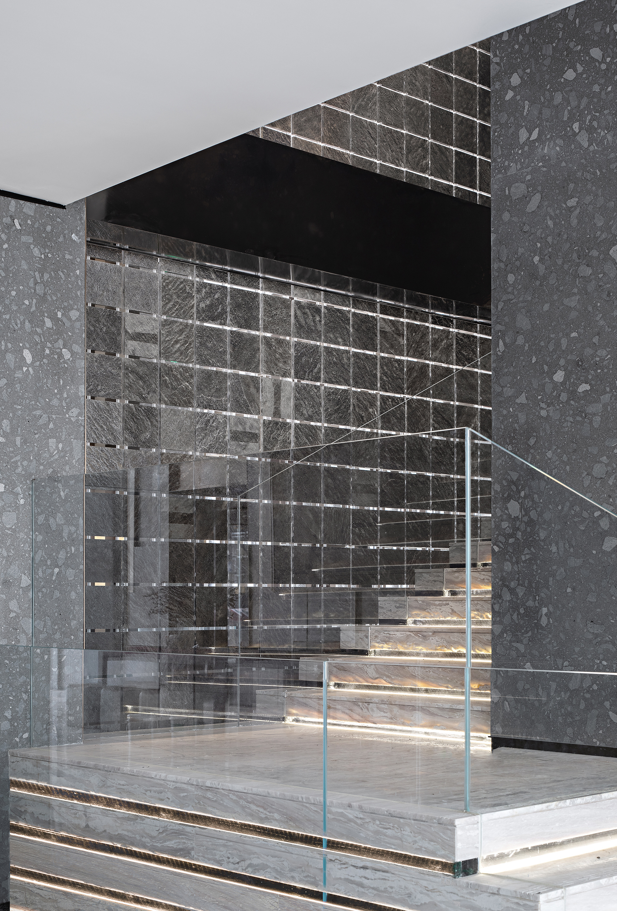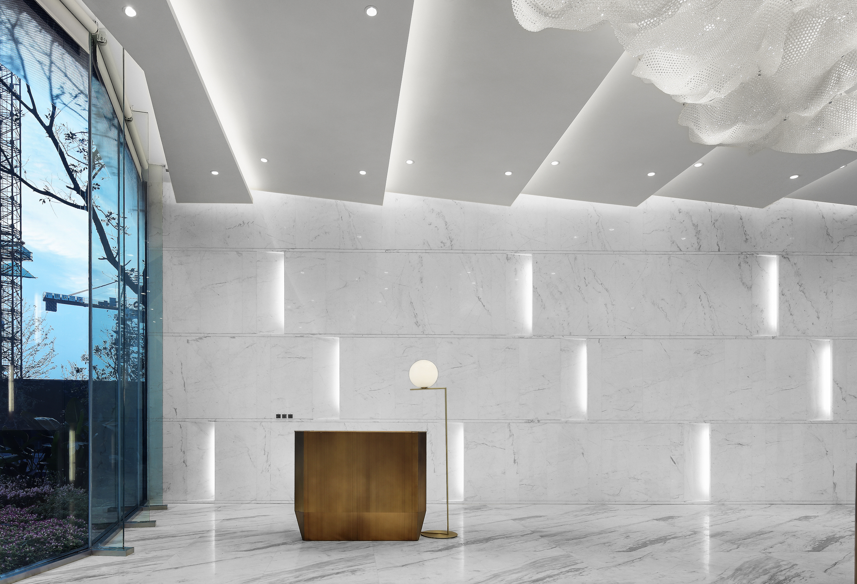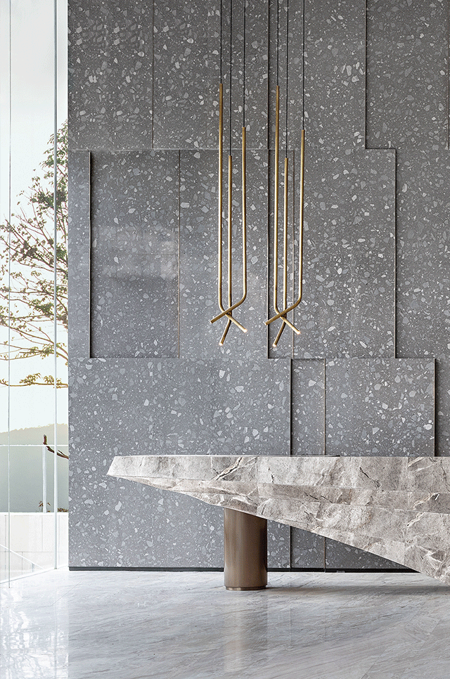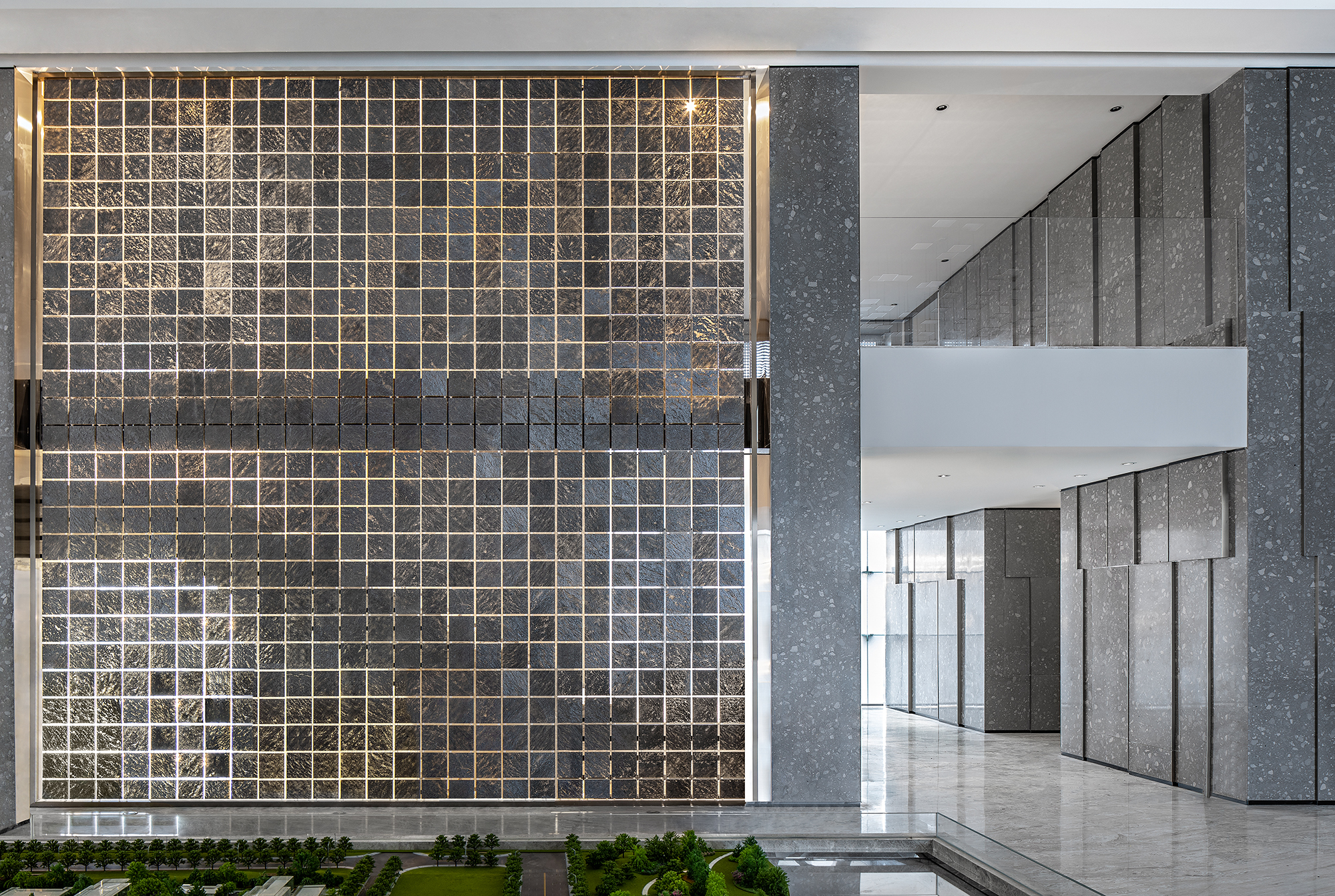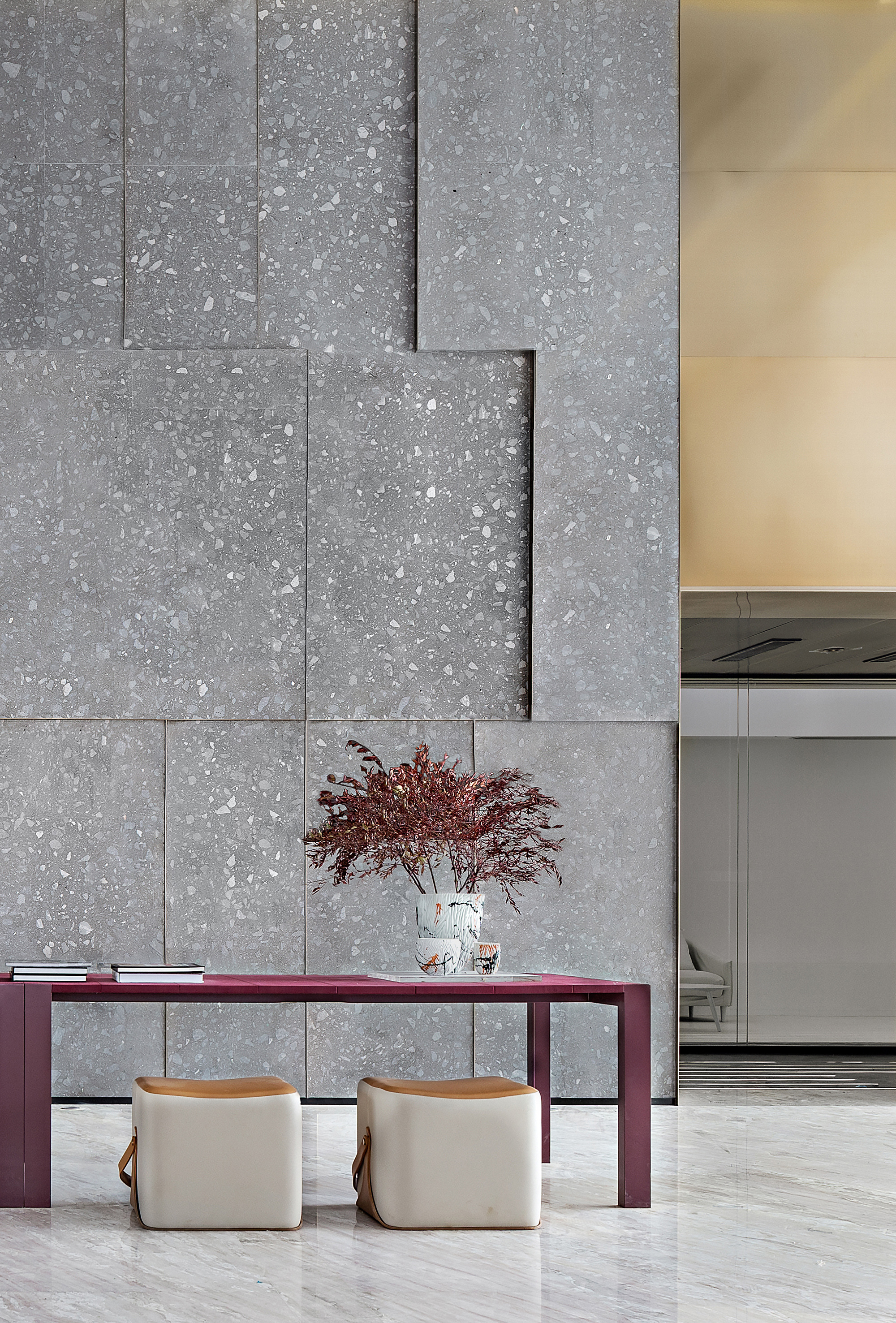 接待區(qū)地面鋪陳的大理石石材帶著流動的張力,自然而然地呈露出大江迸流的寫意之美。透明水波紋亞克力串聯(lián)的屏風如浪濤般綿延,大江大湖的氣勢盎然溢出,宛如瞬間的波瀾壯闊在空間中定格。古堡灰大理石石材砌成的前臺,其別致的造型宛如一艘即將揚帆起航的船,駛在綿延不絕的時代長河,空靈、清遠而意蘊悠長。
