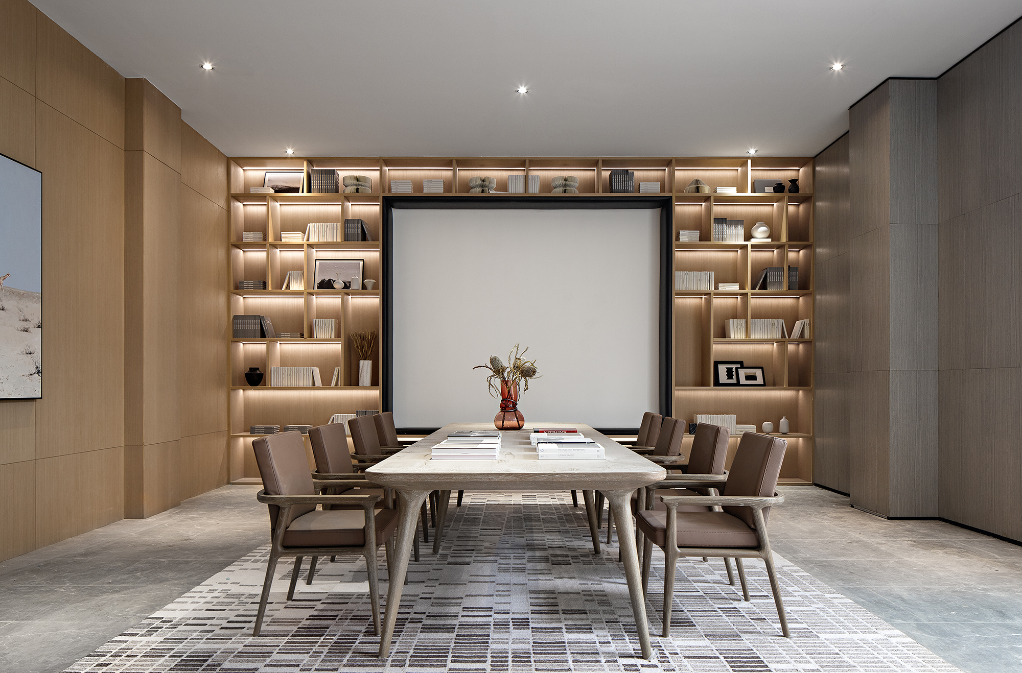洽談區(qū)有序列的椅榻桌幾,松軟的沙發(fā),圍合出日常況味,讓人心靈深處的自在隨之溢出;絨紅、灰白、雅棕是深談區(qū)的主色調,飾品清雋簡潔,不經意地藝術雕塑點綴其中,形成猶如美術館般高雅的藝術氛圍。(圖20)