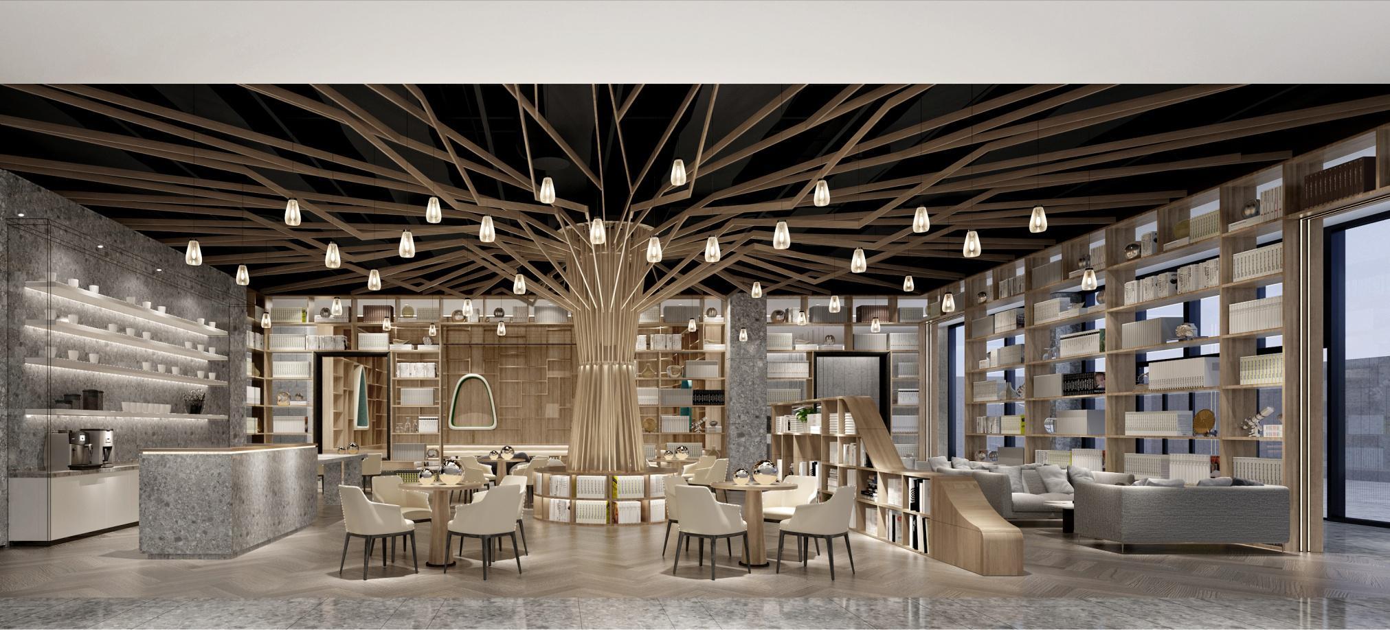 在休閑閱讀區(qū),設計師在室內裝置著一株巨大的“樹”,沉實的棕色鋁方通金屬從地面支柱搭建出向上伸 展的“樹杈枝椏”,儼然有序的布滿整個天花板,其視覺張力描繪出自然森林的勃勃生機。一顆顆熠熠的吊燈垂墜而下,像結落的果實,輕巧地點綴了空間的視覺重心,趣味盎然。