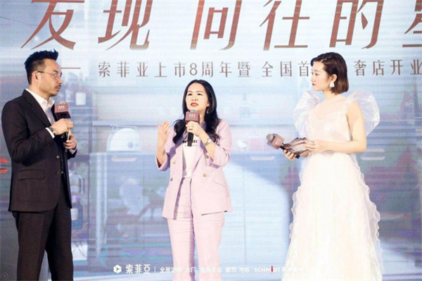 汪涵與索菲亞公司領(lǐng)導(dǎo)同臺(tái)慶祝索菲亞上市8周年及全國(guó)首家輕奢店開(kāi)業(yè)儀式,將現(xiàn)場(chǎng)氣氛再次推向高潮。