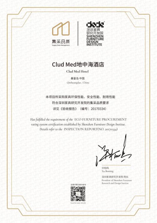 深圳家具研究開(kāi)發(fā)院將為所有符合標(biāo)準(zhǔn)要求的酒店項(xiàng)目授予專屬證書(shū),掃描二維碼即可看到質(zhì)量監(jiān)理的圖文全程,以第三方背書(shū),向酒店客人展示家具的高品質(zhì)。