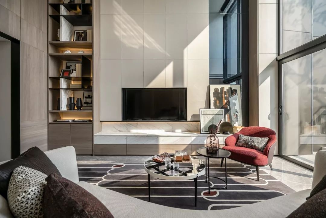 雙層挑空客廳格局朗闊大氣,大面積全明落地玻璃窗引入更寬廣的視域景致,描摹光影與自然的小詩,為客廳鍍上一層經(jīng)久不散的溫煦柔光。清淺色調(diào)形構(gòu)出場域的休閑氛圍,與妍麗紅調(diào)碰撞,在顏色遞變的藝術(shù)中,抒寫生活美學(xué)的定義。