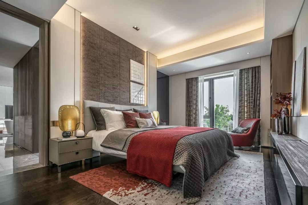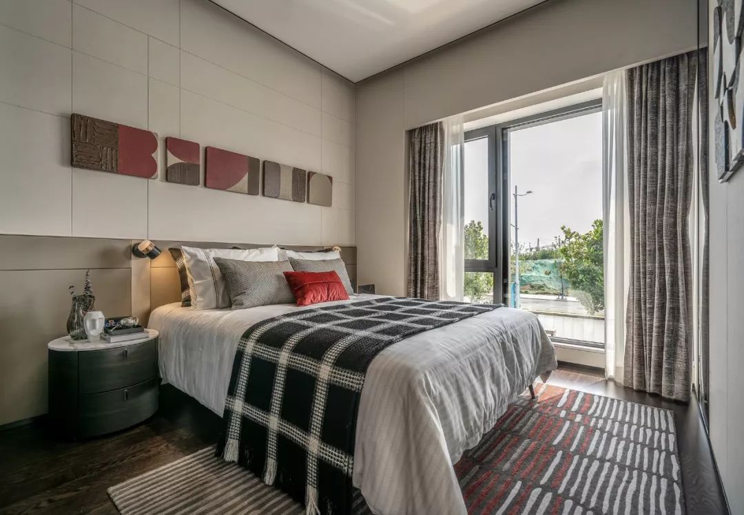 次臥設(shè)計通過幾何線條的介入將空間體量簡化,剔除瑣碎,在基本元素的抽象演繹下,延續(xù)紅調(diào)的點綴作用。豐沛的自然光線,細(xì)膩親膚的床品,營造出溫馨舒適的休憩空間,讓人卸下疲憊,塵囂煩擾俱消。