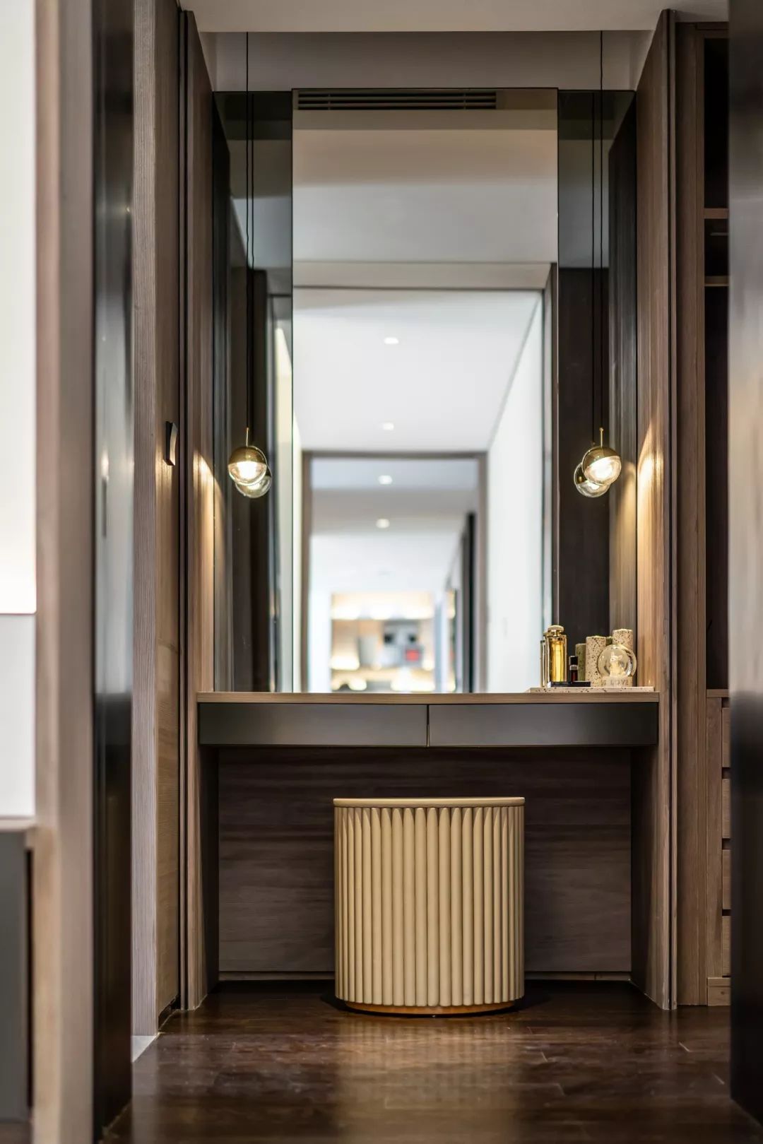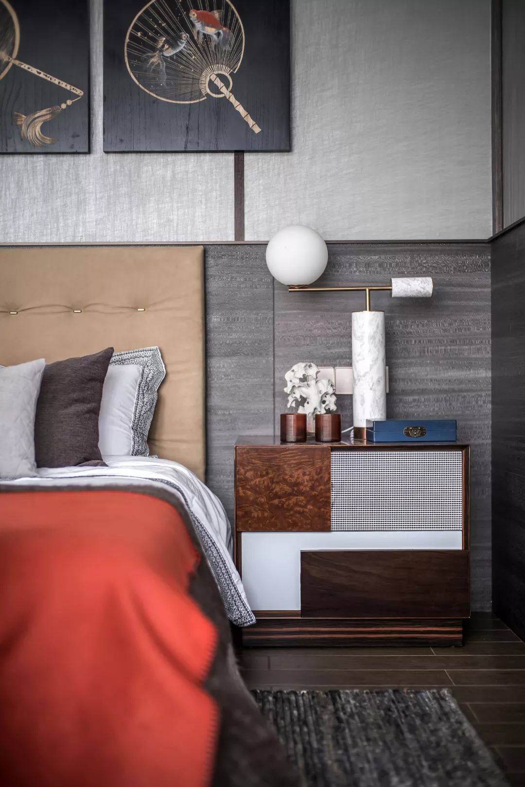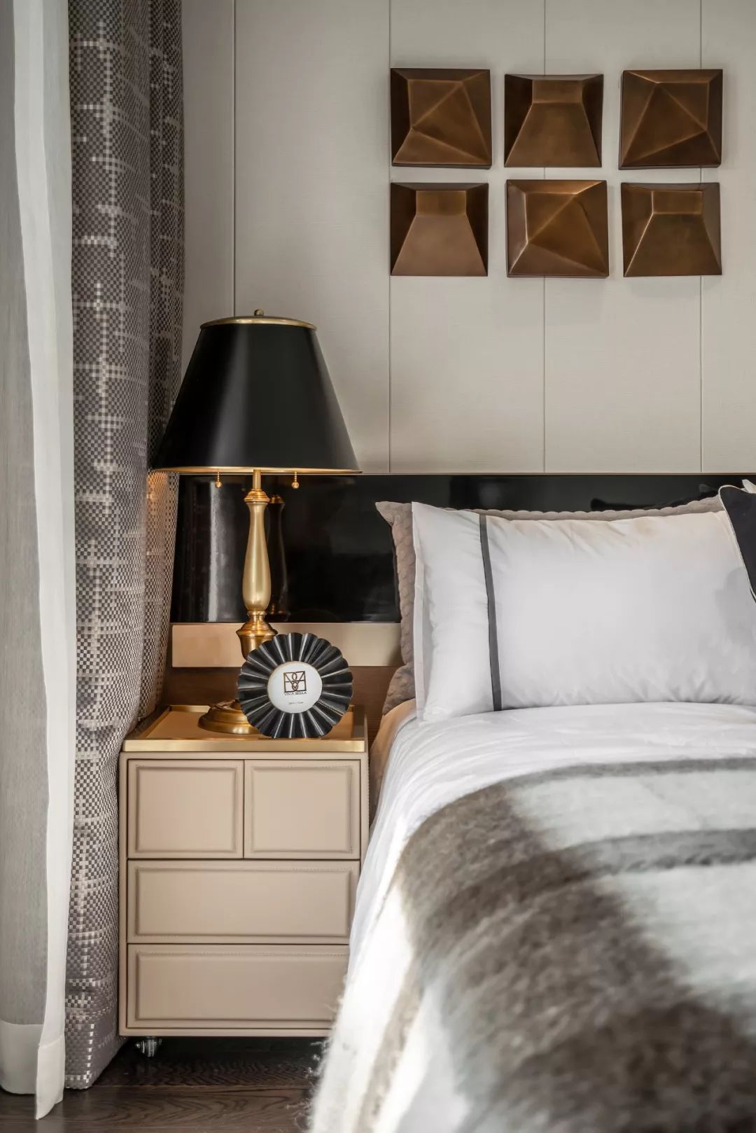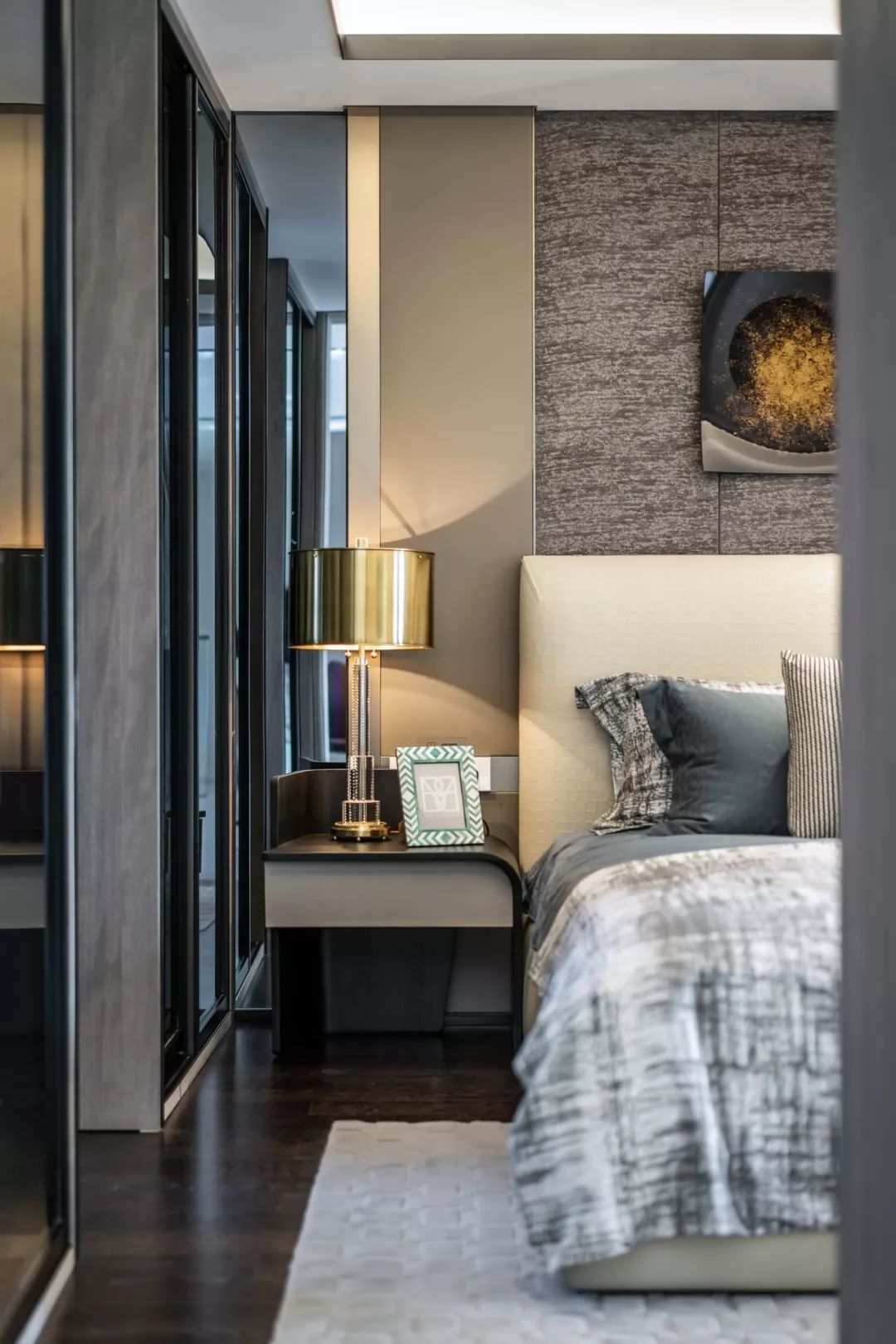 睿智黑、古銅金、優(yōu)雅灰在主臥交織共映,邦邦將幾何元素編織其間,于抽象與具象、虛與實的觀感和想象中,發(fā)起規(guī)則與不規(guī)則的紋理互動,表達(dá)時代領(lǐng)軍階層的藝術(shù)精神,匹配主人房的至臻格調(diào)與審美品味。