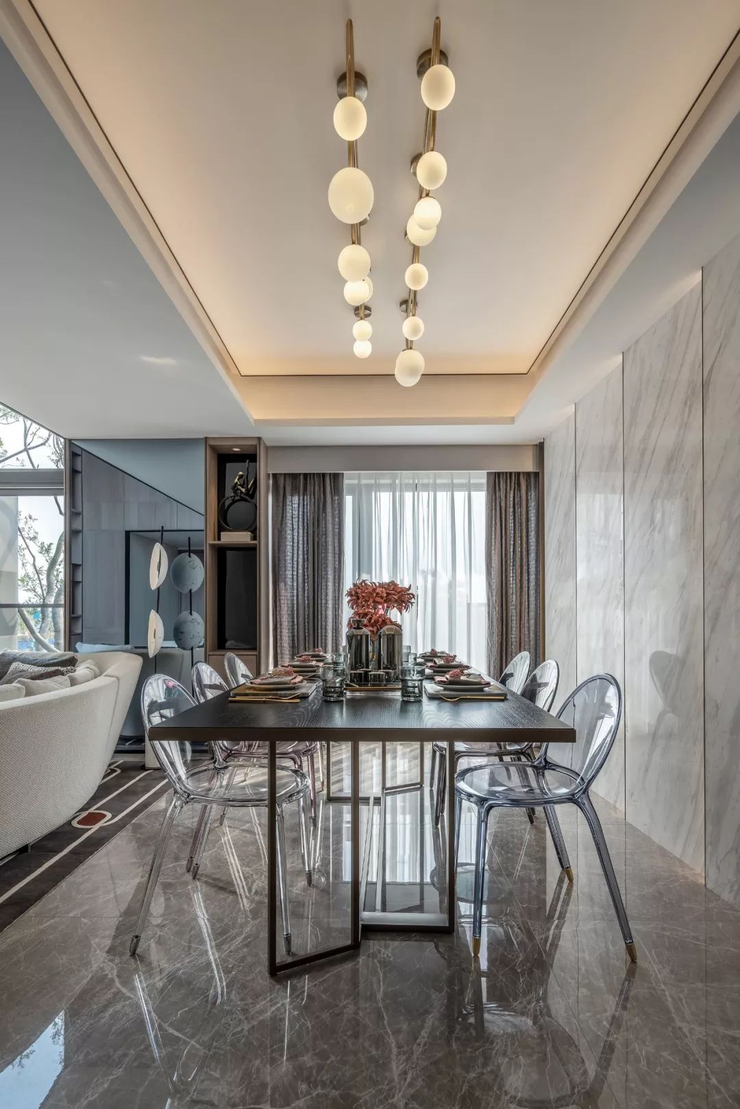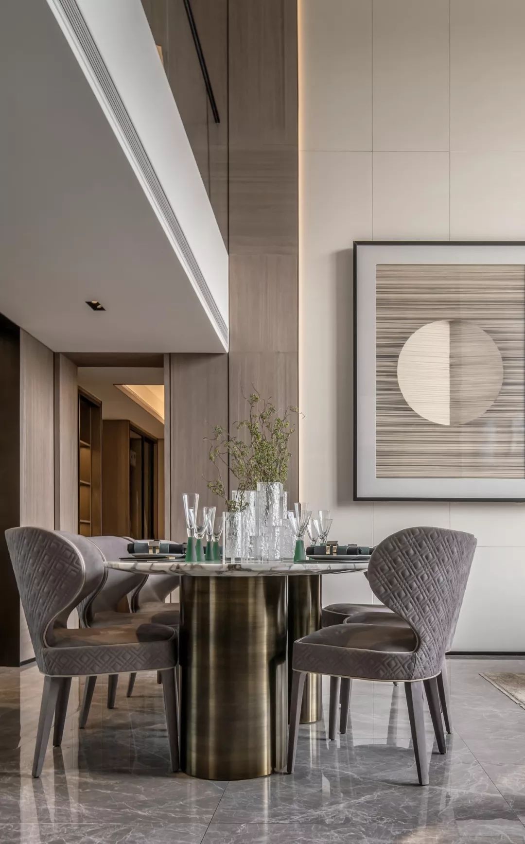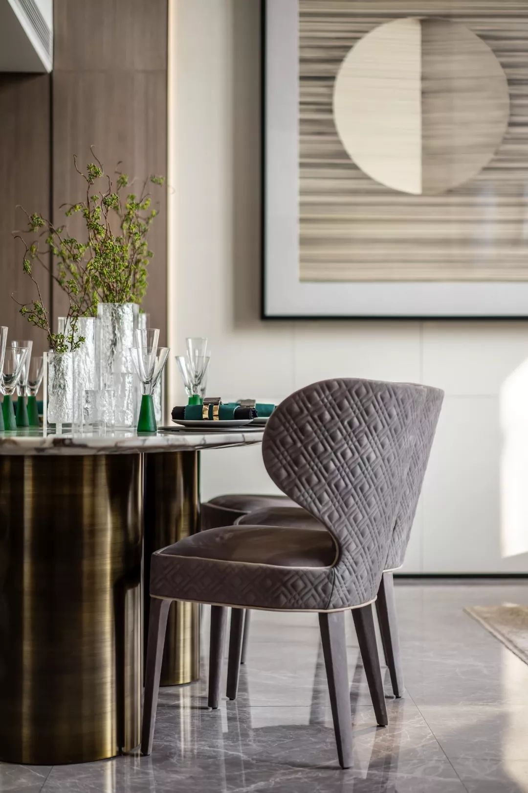 自舒展的客廳場域步入餐廳,層高的變化使室內(nèi)大空間有目的地被界分,構(gòu)成了氣場節(jié)奏的變幻。五折形制的水紋大理石背景墻自折痕處散發(fā)柔光,與對稱的幾何形制組燈輝映,觀照空間內(nèi)飾的細(xì)節(jié),于鮮妍花藝、通透多彩的杯盞與餐椅上精筑藝術(shù)情致,完美詮釋了現(xiàn)代高雅空間的出塵氣質(zhì)。