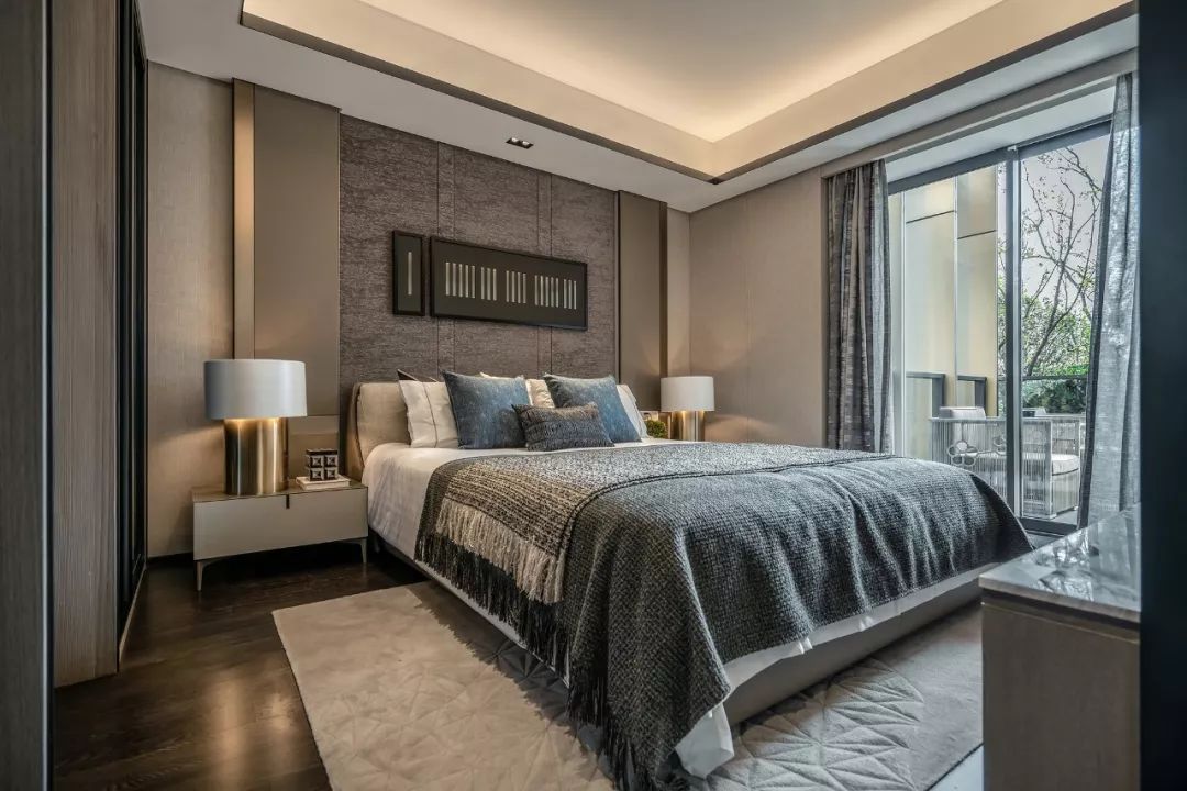 長輩房的軟飾與設(shè)色呈現(xiàn)出穩(wěn)重內(nèi)斂的氣質(zhì),深淺不一的雅灰在空間中得以廣泛運用,點綴以磨砂藍(lán)抱枕,突出床品的細(xì)膩質(zhì)感與臥室的宜居屬性。