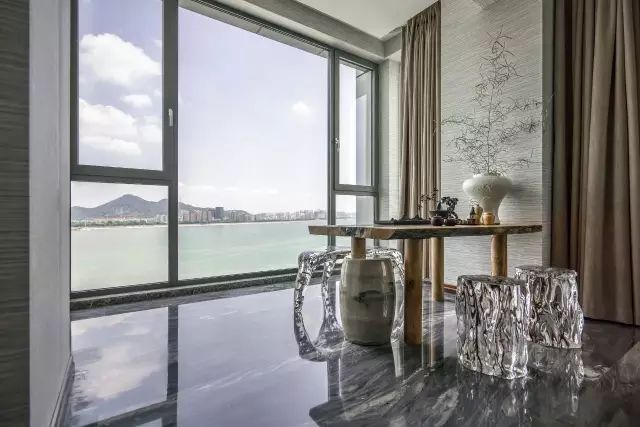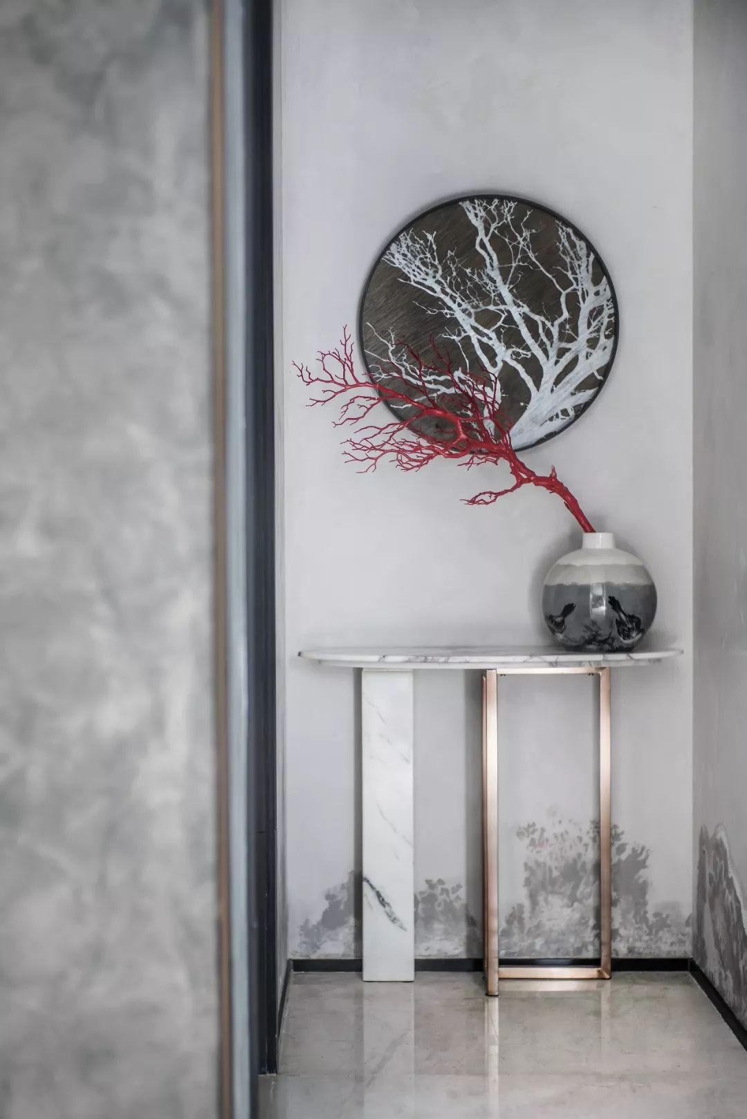 設(shè)計將高級灰貫穿整個空間,剔除瑣碎的裝飾,僅以雅麗的梅和輕簡的竹進(jìn)行裝點,窗外,是涳濛的錢塘江山,屋內(nèi),是輕巧升騰的詩畫意境。
