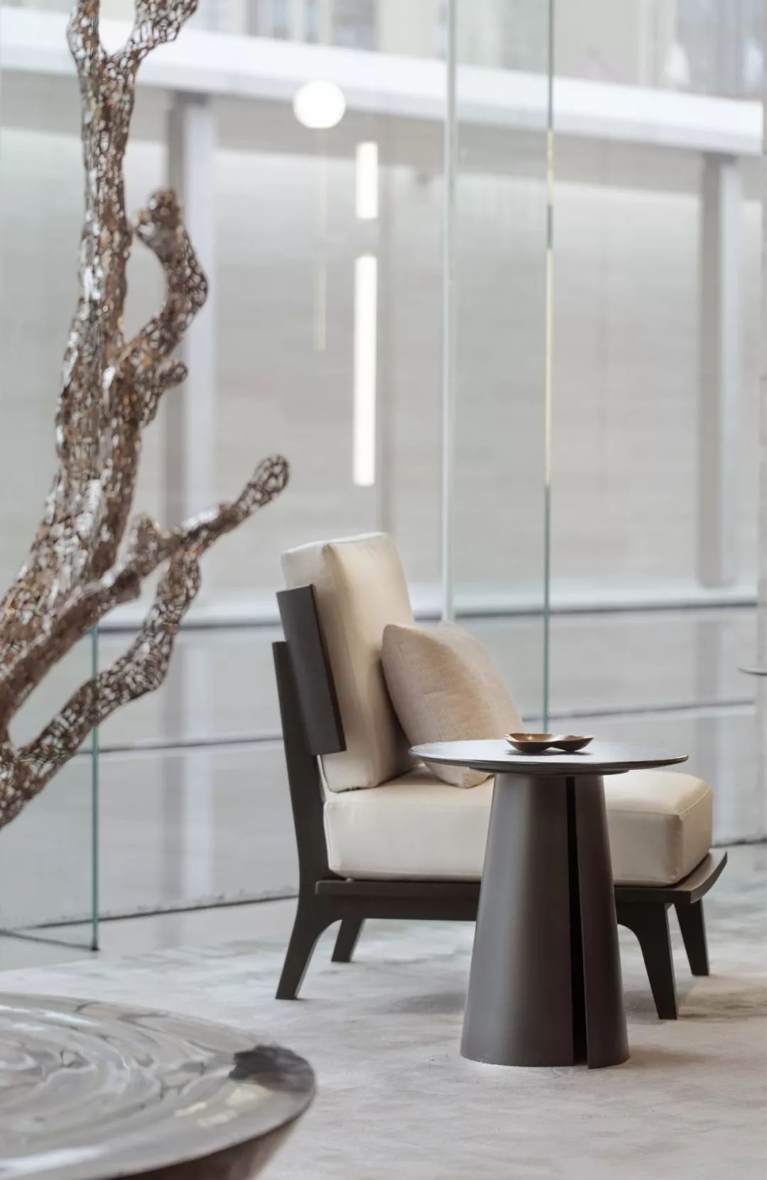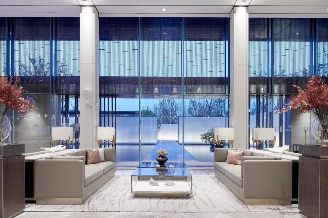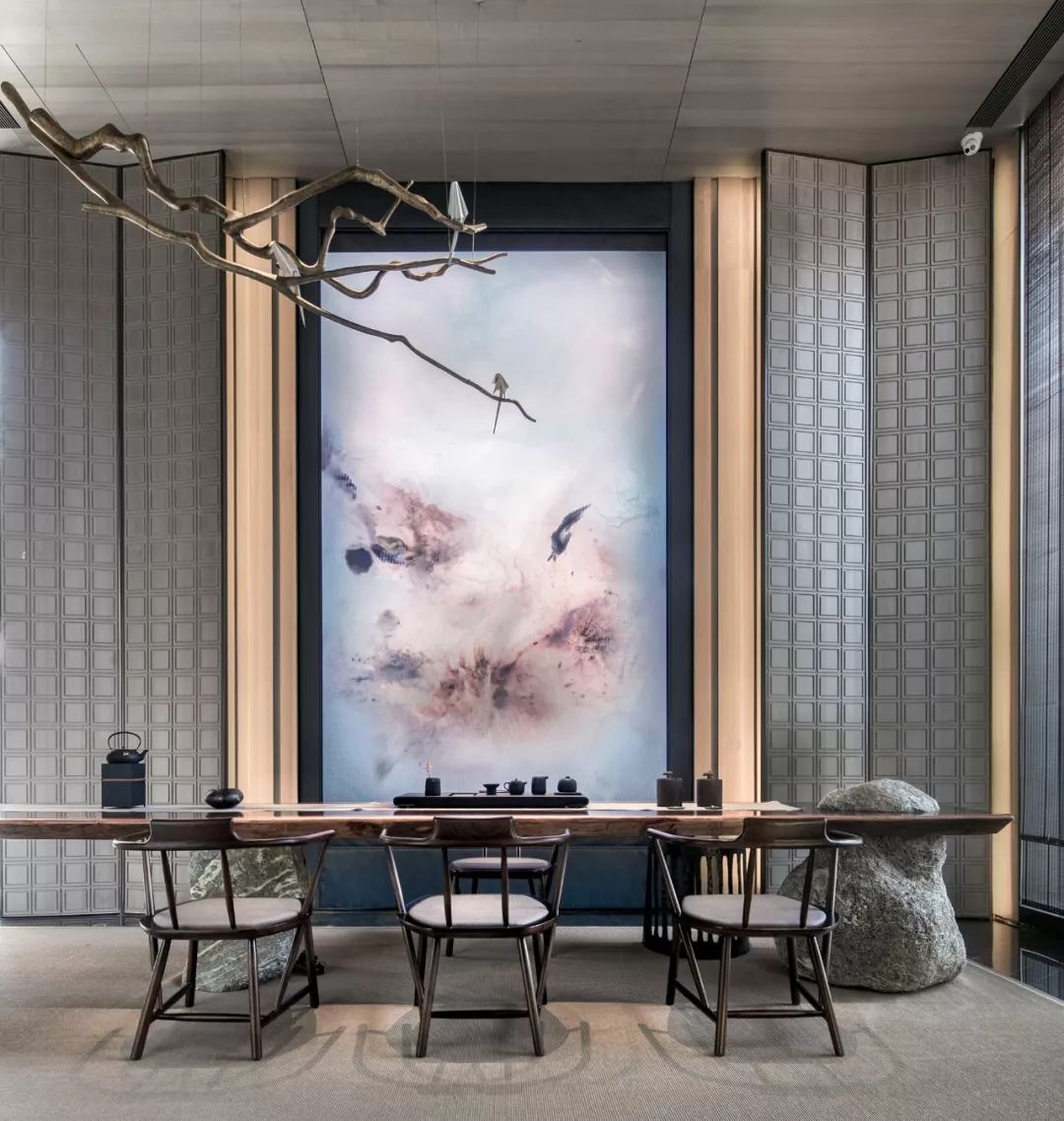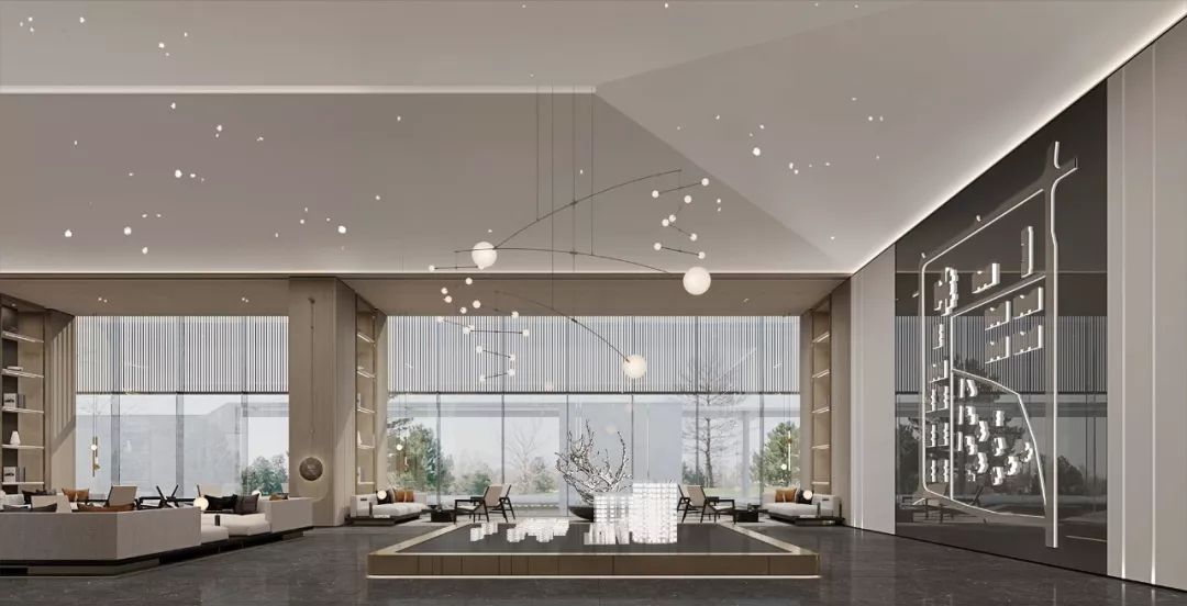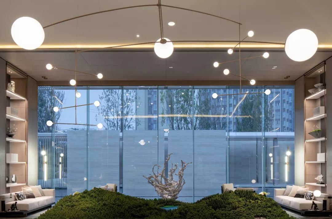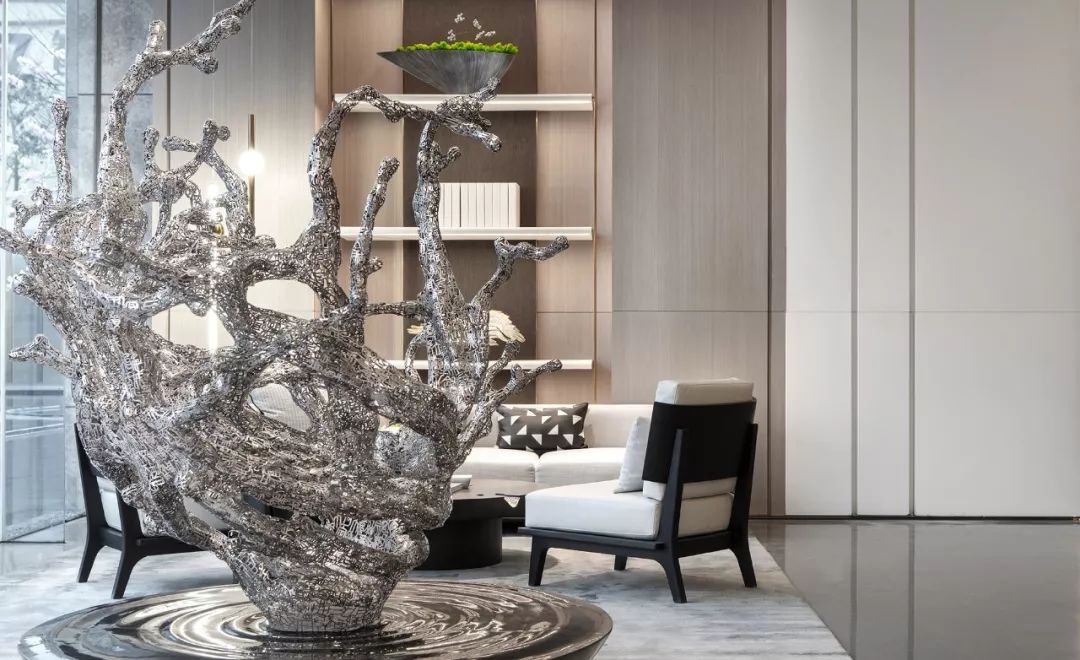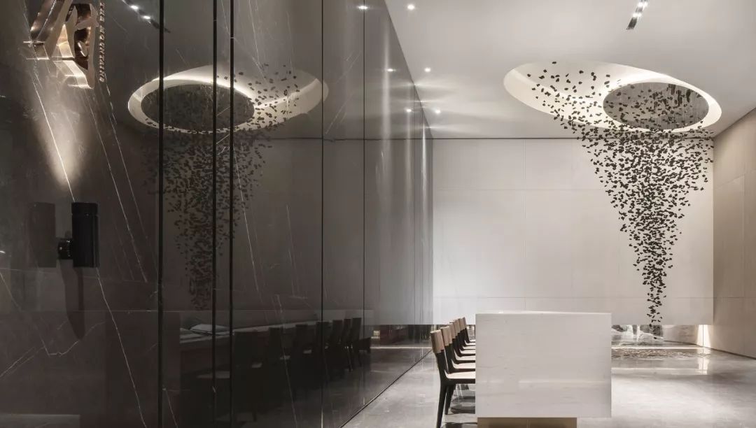 設(shè)計師通過大面積全明落地玻璃窗,最大程度地將室外的建筑、景觀效果納入室內(nèi)視野,以觀景式空間概念記錄時移景易的歲月縮影。VIP洽談區(qū)臨窗而設(shè),毗鄰戶外水院,人靜坐此處,天光云影、山石水致盡落入眼底,愜意悠悠。此間以清雅木藝置物架巧妙隔斷,所列器玩飾物無一不精致樸雅,設(shè)計師巧妙置入以水漪形制為底座的銀色樹形藝術(shù)端景,樹形由一個個古文字符接砌而成,以形寫意一幅人文藝術(shù)與自然之水碰撞而涎玉沫珠的畫面,將時光的韻味抒發(fā)到極致。