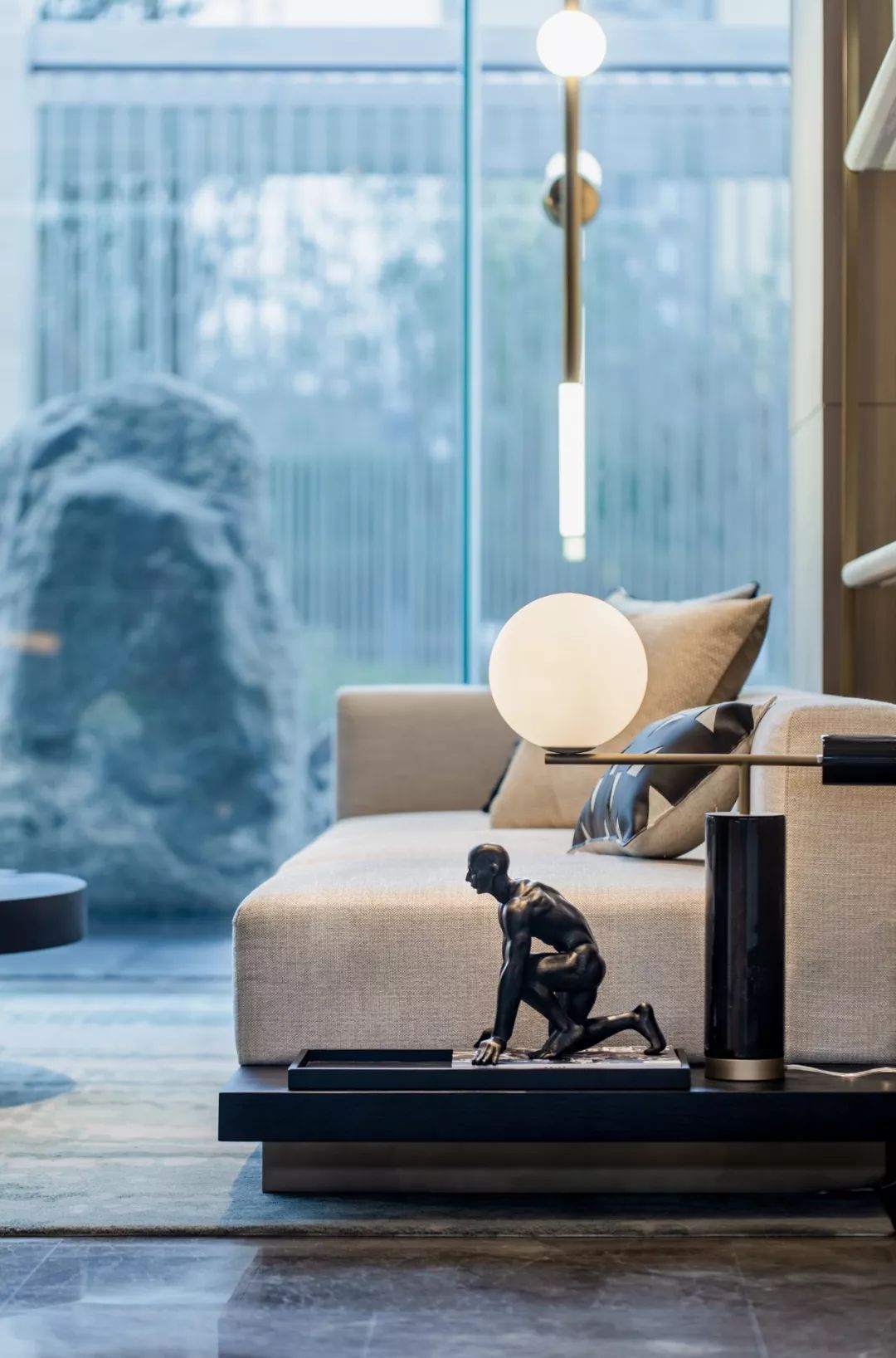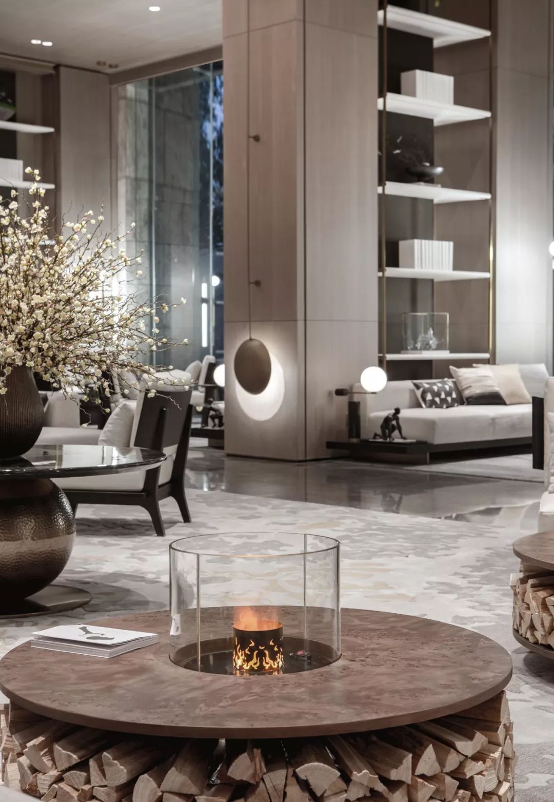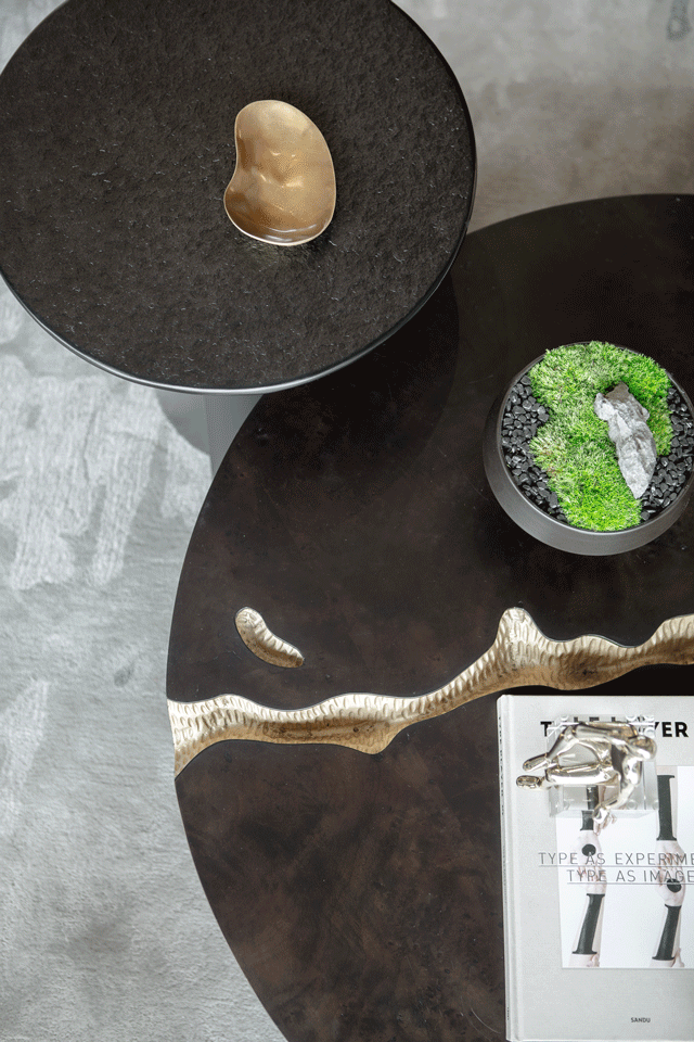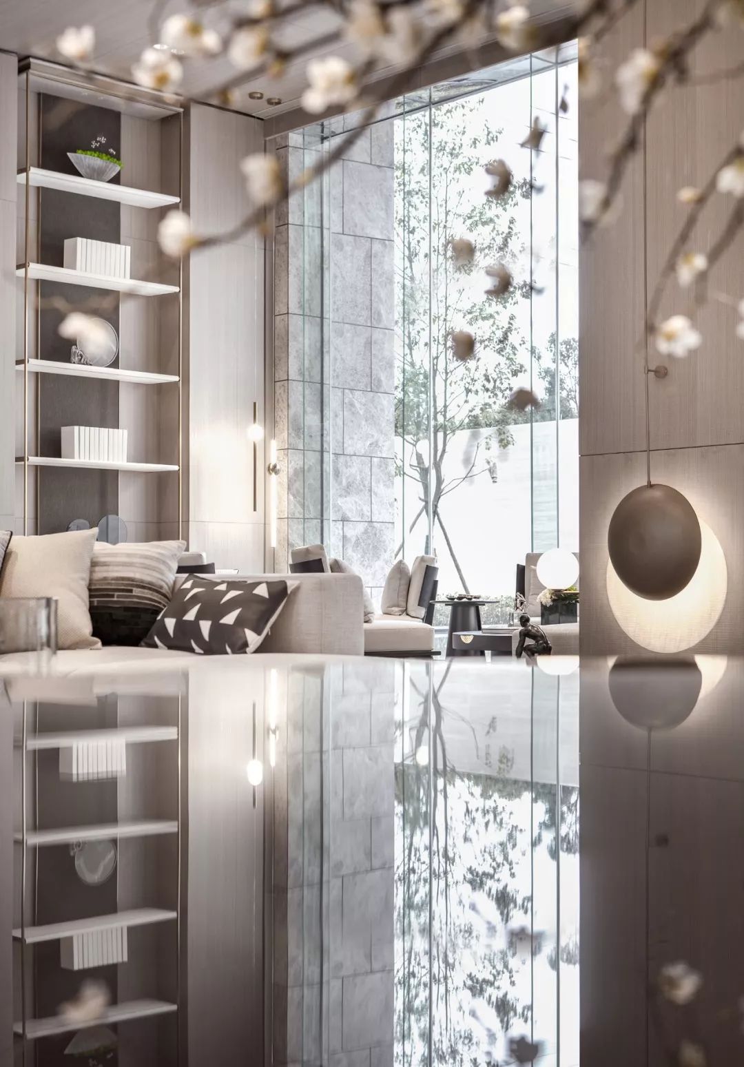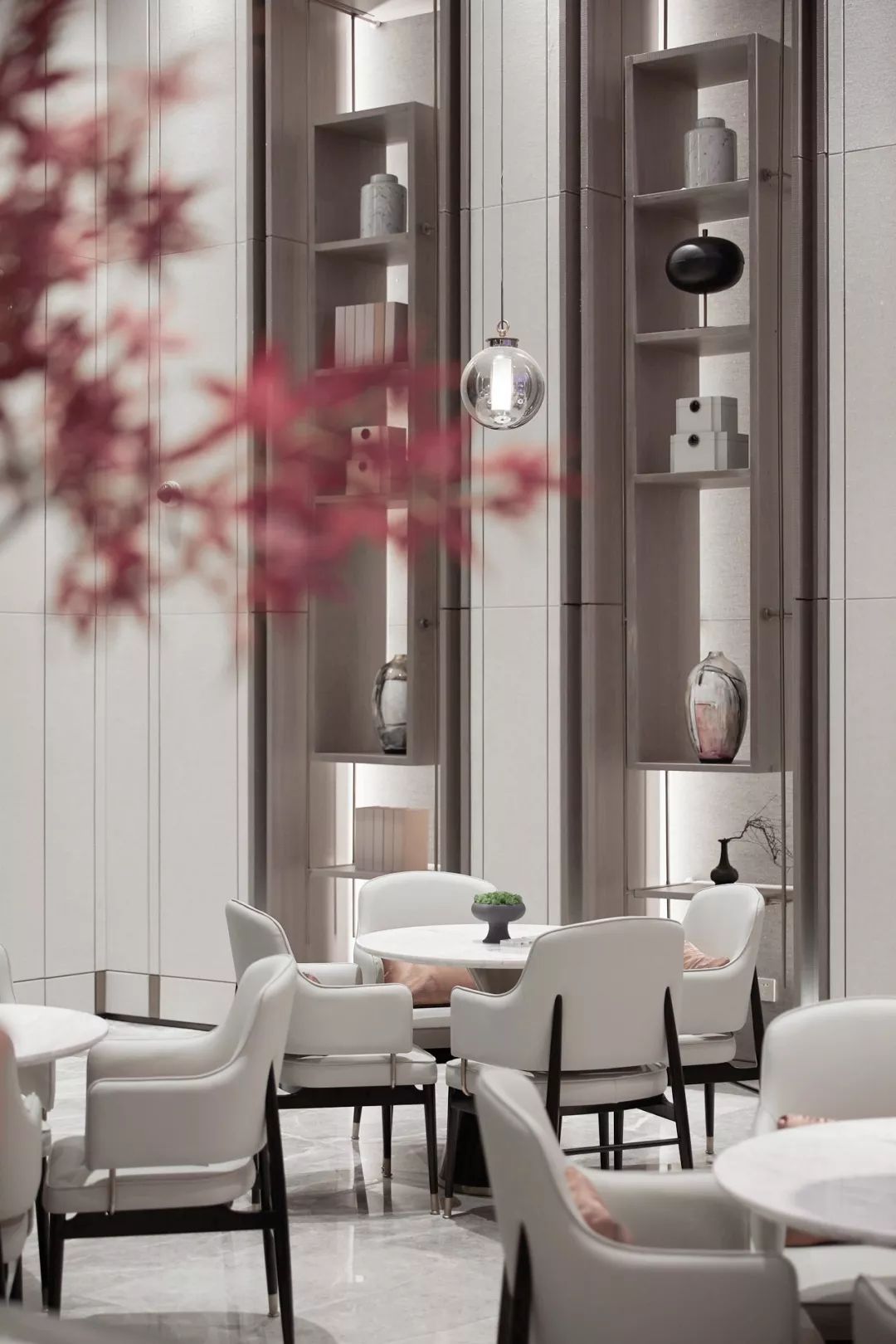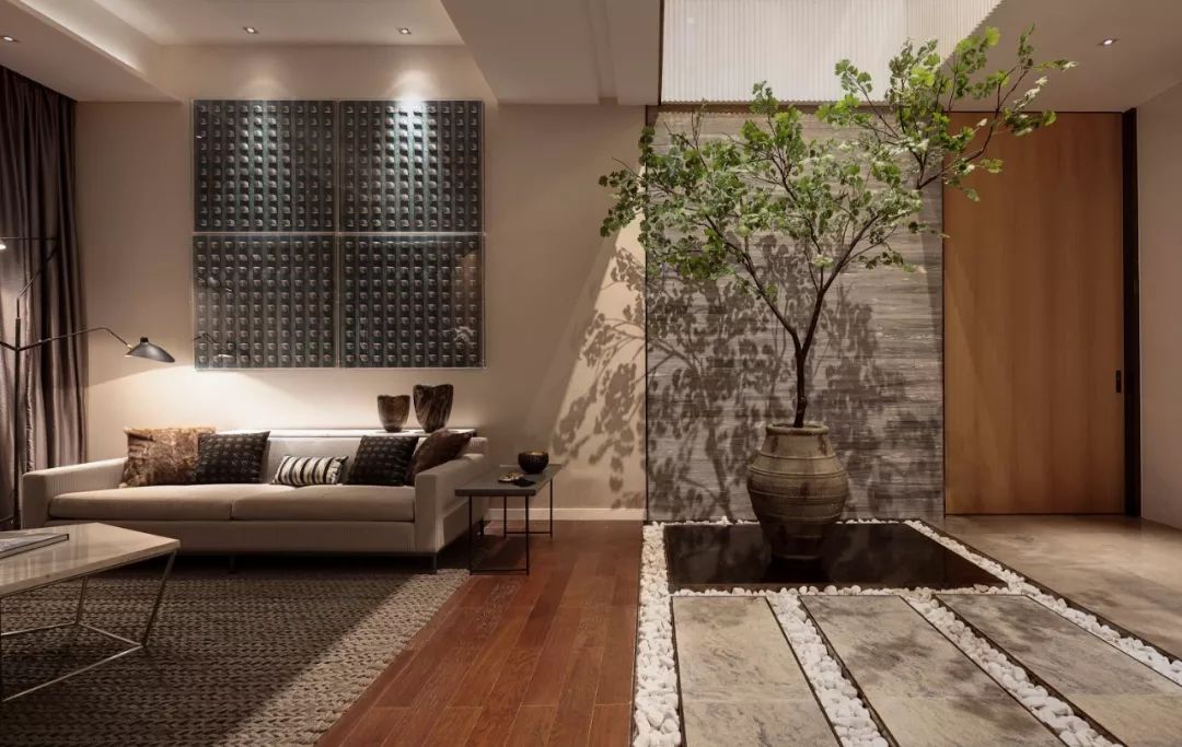 設(shè)計師通過大面積全明落地玻璃窗,最大程度地將室外的建筑、景觀效果納入室內(nèi)視野,以觀景式空間概念記錄時移景易的歲月縮影。VIP洽談區(qū)臨窗而設(shè),毗鄰戶外水院,人靜坐此處,天光云影、山石水致盡落入眼底,愜意悠悠。此間以清雅木藝置物架巧妙隔斷,所列器玩飾物無一不精致樸雅,設(shè)計師巧妙置入以水漪形制為底座的銀色樹形藝術(shù)端景,樹形由一個個古文字符接砌而成,以形寫意一幅人文藝術(shù)與自然之水碰撞而涎玉沫珠的畫面,將時光的韻味抒發(fā)到極致。